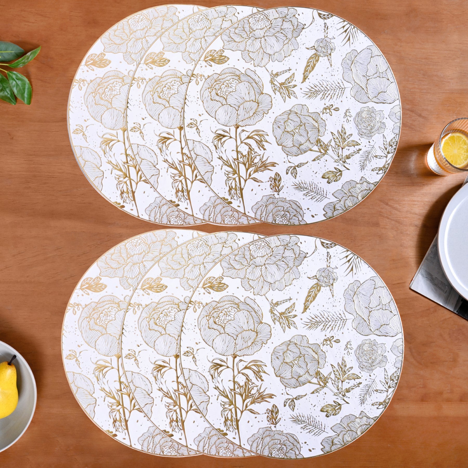 Each mat is generously sized in a round shape, ideal for standard dinner plates with room for cutlery and glassware, offering both style and full coverage.