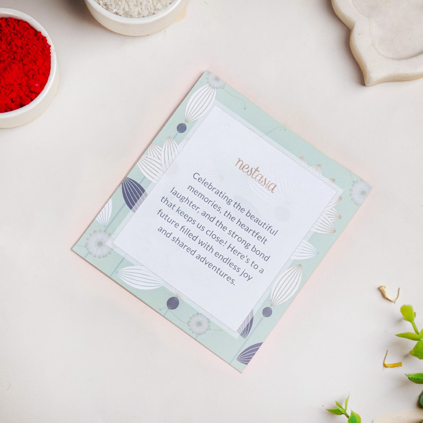 Warm tones, warmer bonds! Celebrate Rakhi with this elegant, warm-toned Rakhi-Lumba set. The Rakhi features champagne-toned beads, creamy pearls, and a glittering floral bead, all tied on a soft beige thread. The Lumba, crafted for a sister-in-law, is more intricate, with a large pearl charm, delicate floral accents, and a sparkling bead that mirrors the Rakhi. Rhinestone-studded leaves, a translucent floral charm with golden tips, and a dangling pearl add a graceful, luxurious touch. The Gift Set includes 1 Rakhi, 1 Lumba, 1 Mixed Dry Fruit, 1 roli-chawal bottle set, and 1 Wish Card.