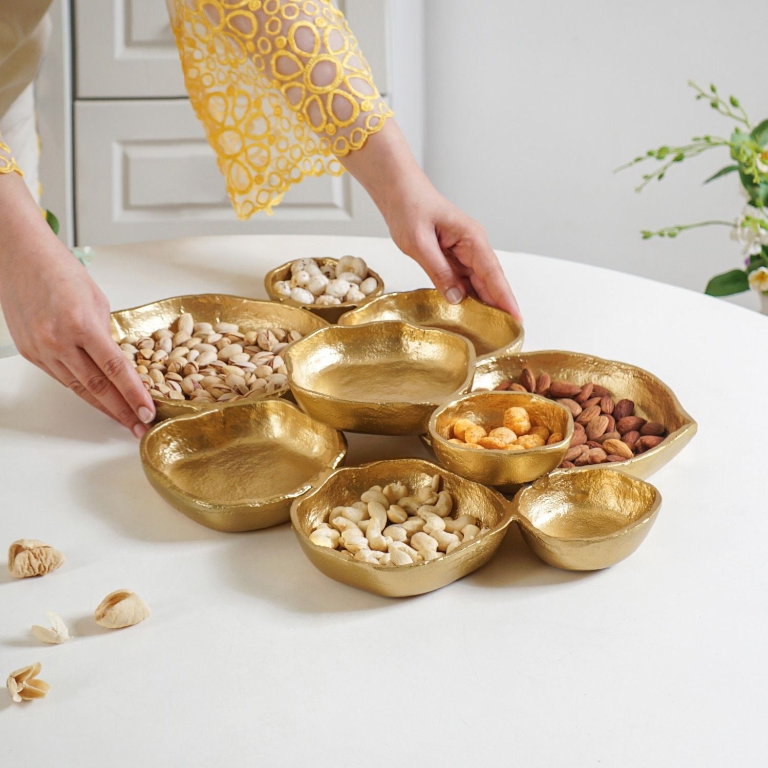 Nestip: This tray can be part of a golden flower rangoli, with different flower petals arranged in each bowl for a captivating display.