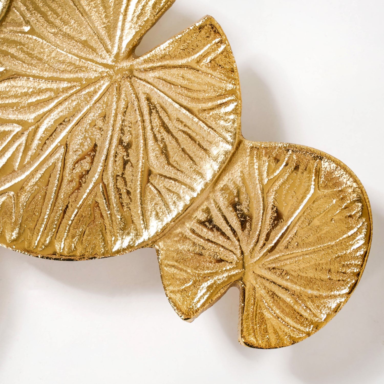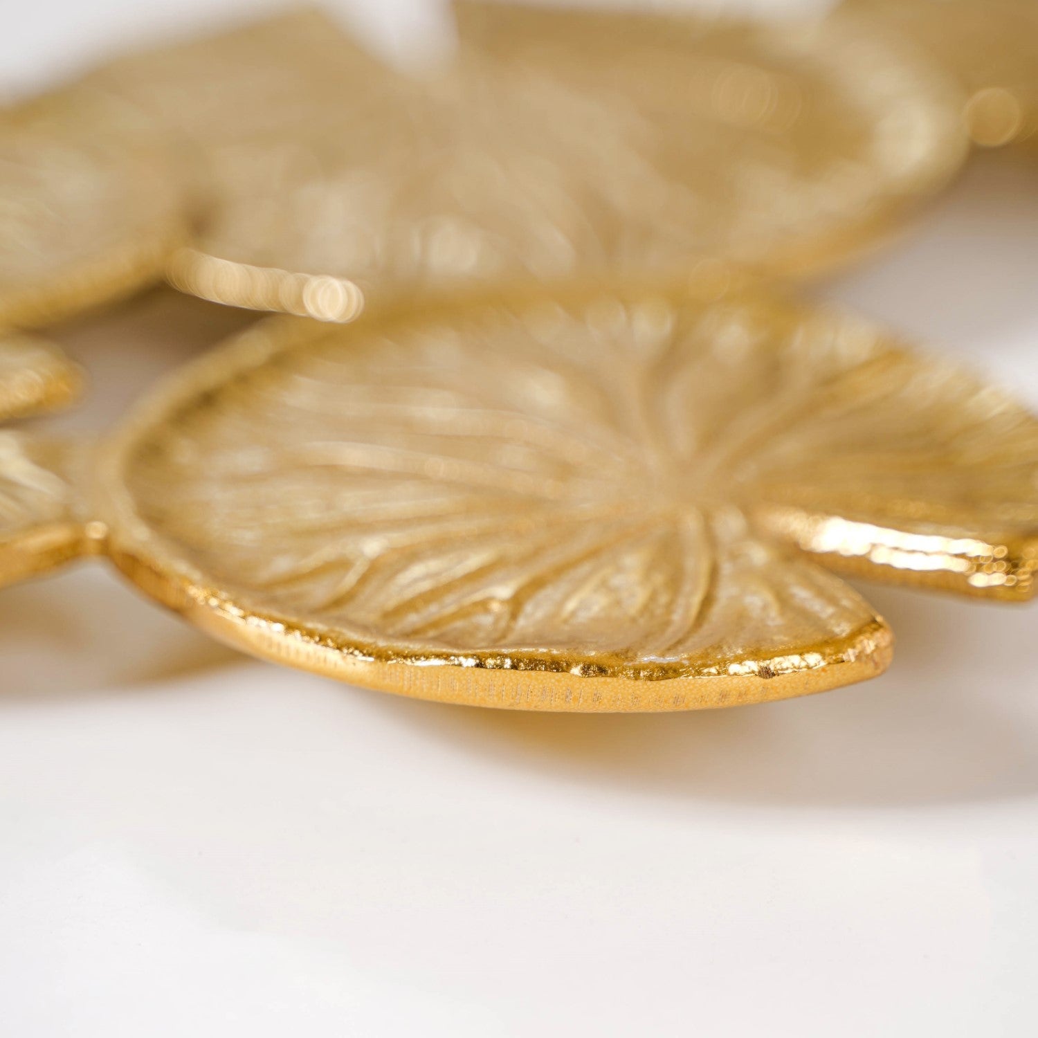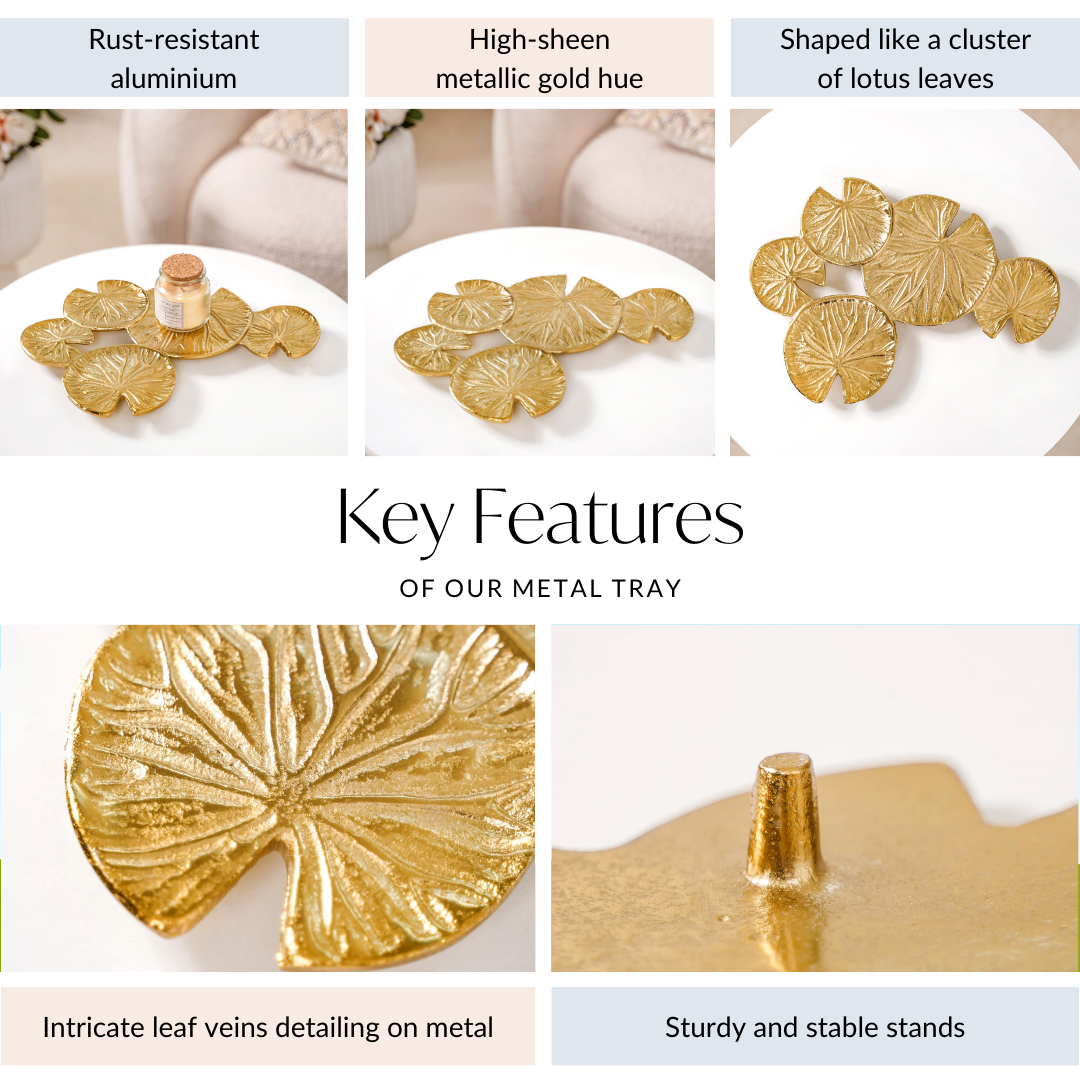 The metal tray can be used as a stunning centrepiece by placing candles, floral arrangements, or decorative ornaments on it. Its unique lotus leaf shape and gold hue make it an eye-catching focal point for any table.