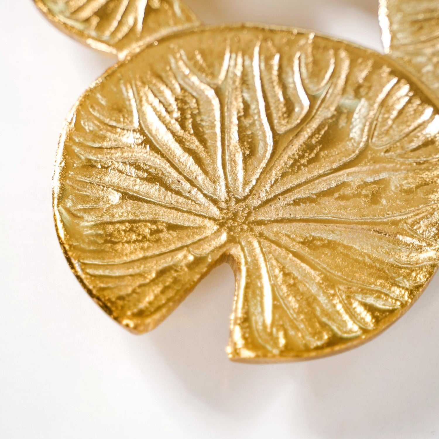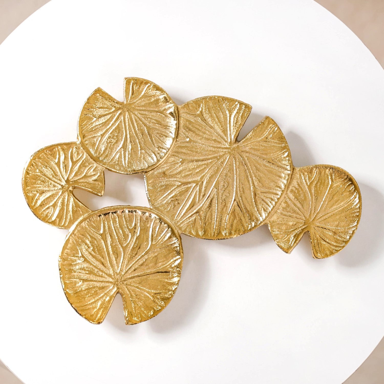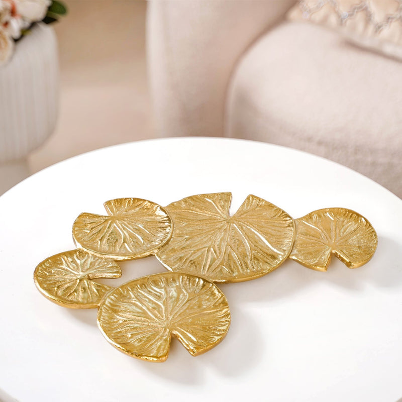 The metal tray can be used as a stunning centrepiece by placing candles, floral arrangements, or decorative ornaments on it. Its unique lotus leaf shape and gold hue make it an eye-catching focal point for any table.