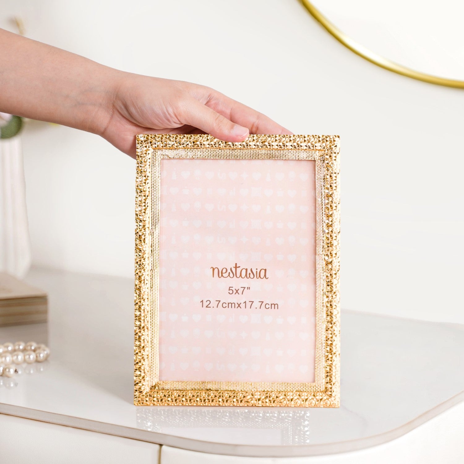 Design: Crafted from premium-quality metal, this photo frame showcases a striking lattice-inspired pattern that beautifully borders your photograph. The polished gold finish exudes warmth and sophistication, making it a statement piece in any decor. It securely holds a standard 5x7" photo behind a clear acrylic cover for lasting brilliance and protection. The frame’s velvet-lined back includes durable rotatable hooks for flexible wall display and a strong easel stand for tabletop placement.