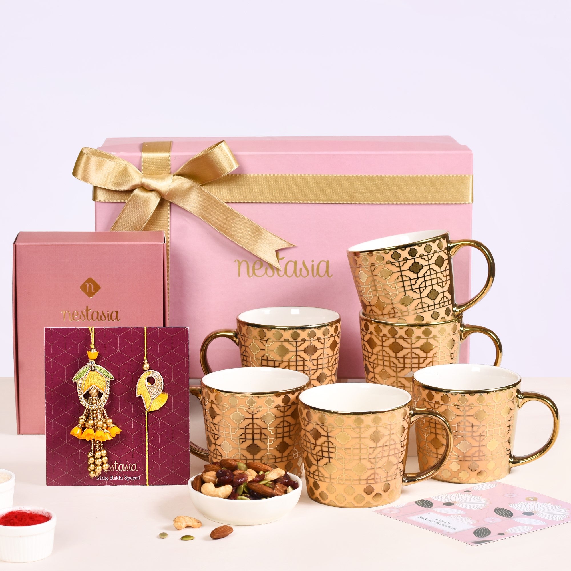 Celebrate the unbreakable bond of sibling love in style with our Rakhi hamper, designed to make this Raksha Bandhan unforgettable! Included in this thoughtful collection are a dazzling Rakhi-Lumba set and a set of 6 coffee mugs with exquisite metallic gold detailing, perfect for your brother and sister-in-law to share heartfelt moments. Complete the ritual with a traditional roli-chawal set, elegantly packaged in a gift box alongside a touching wish card. Indulge in the richness of dry fruits, adding a festive flair to your celebrations. This gift hamper is a perfect blend of tradition and modern elegance, ideal for gifting your sibling with love and joy.