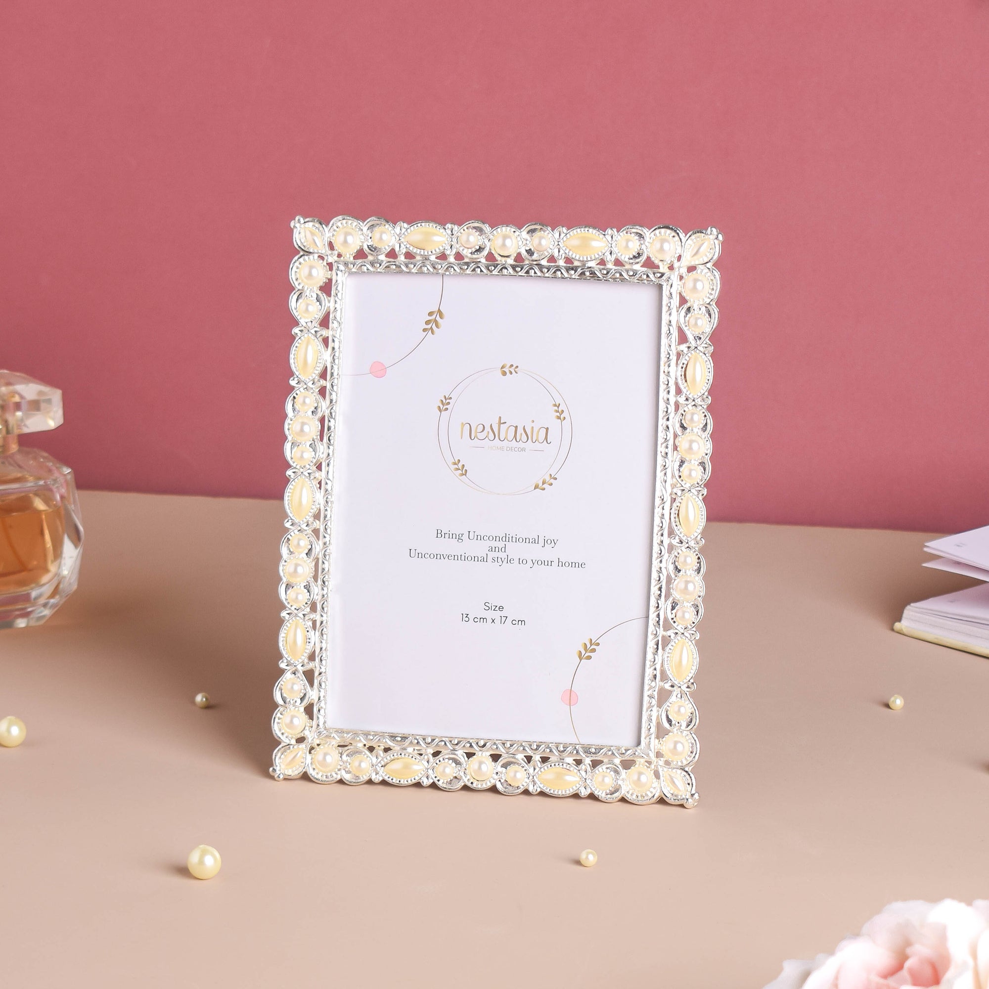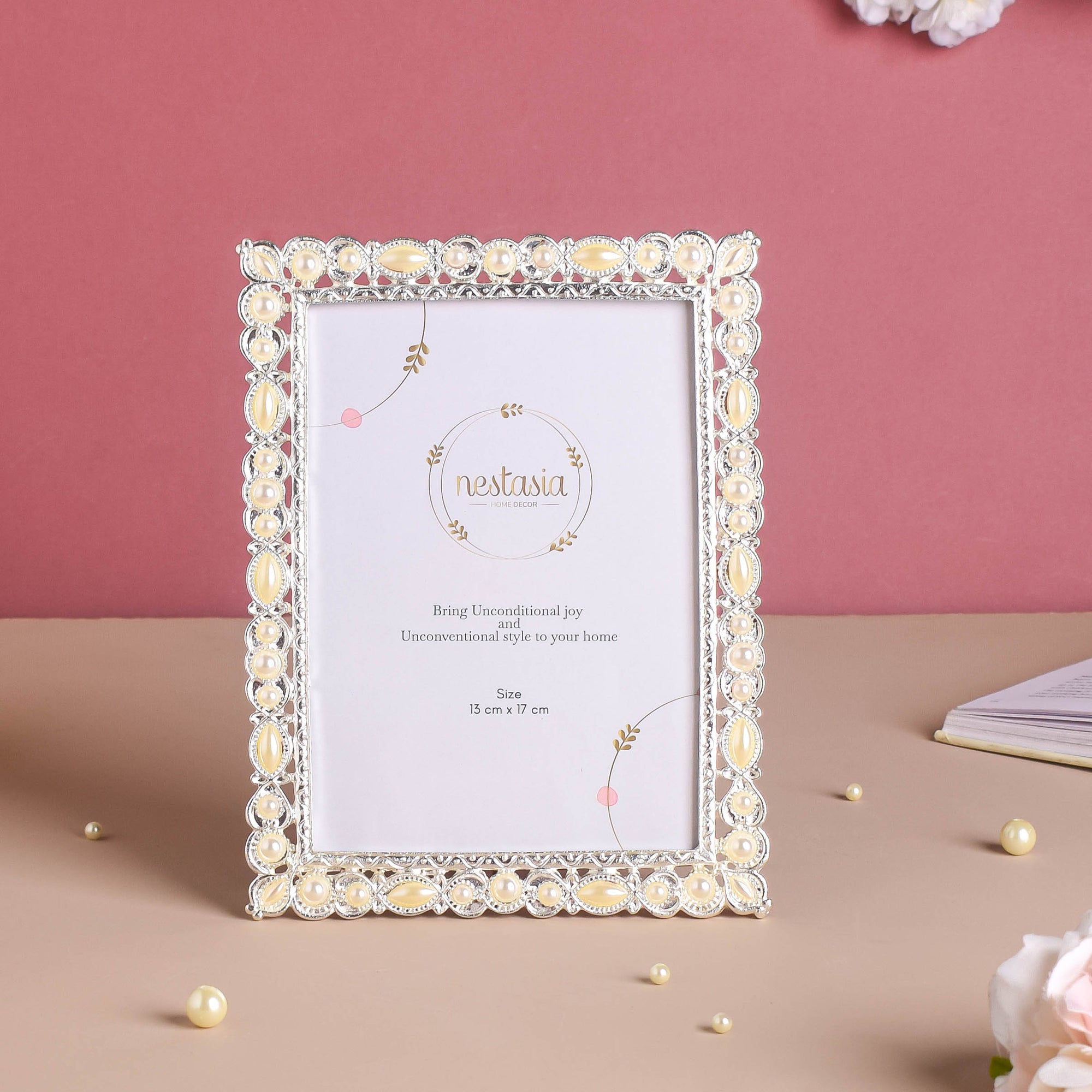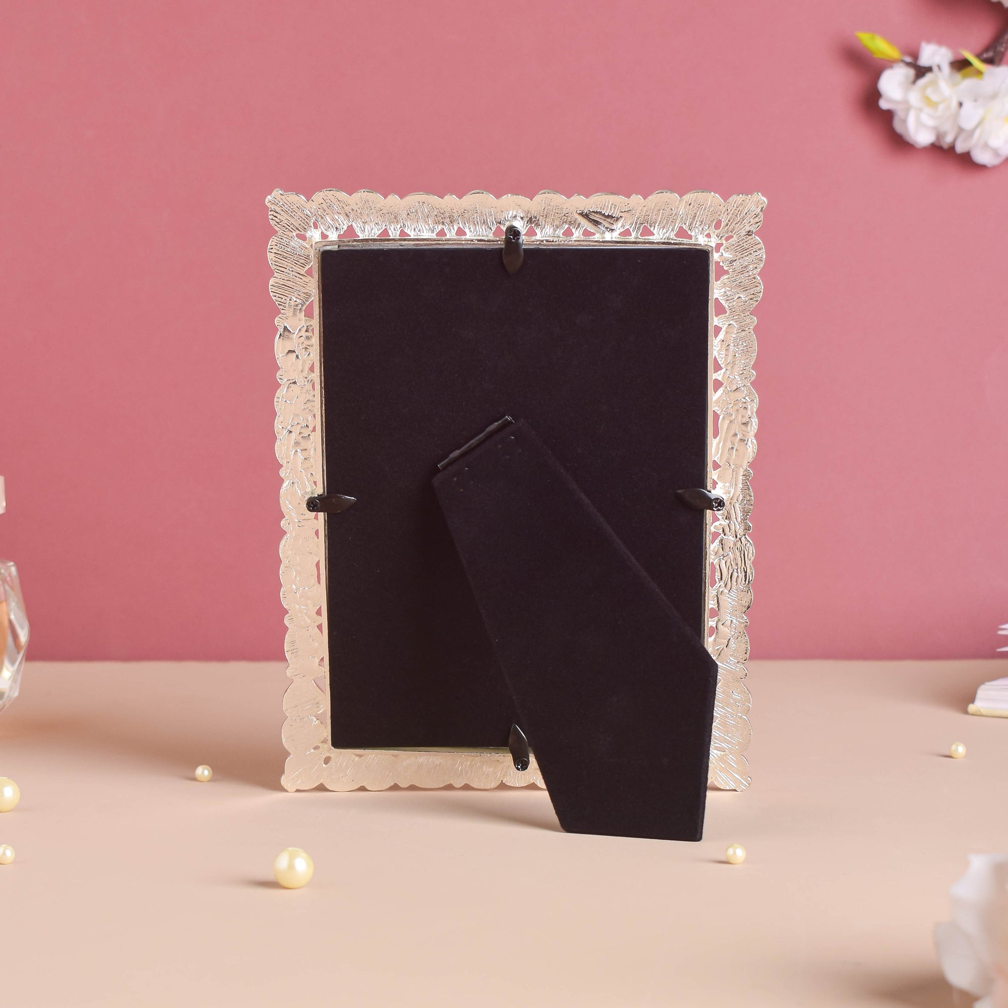 The large-sized vintage photo frame can be the best protector of favorite snaps and shots. Bordering the picture frame on all four sides are delicate, silver motifs and pearl-like embedments. One can add the photo frame to infuse a vintage appeal to one's surroundings.