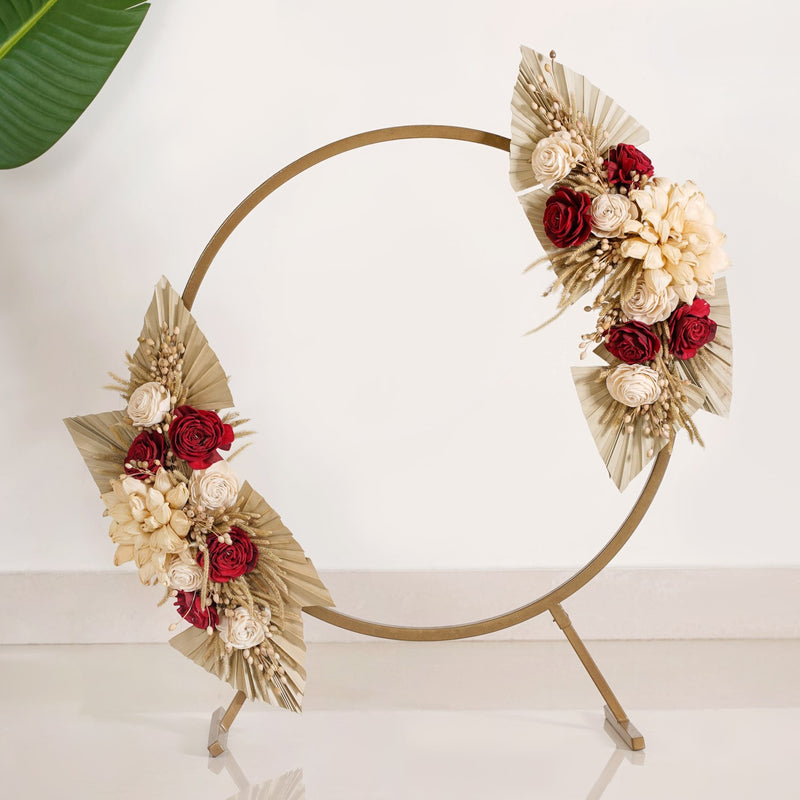 You can hang a variety of decorations, including floral garlands, string lights, macramé hangings, and banners. The frame’s sturdy construction allows for heavier items like greenery or fabric drapes as well.
