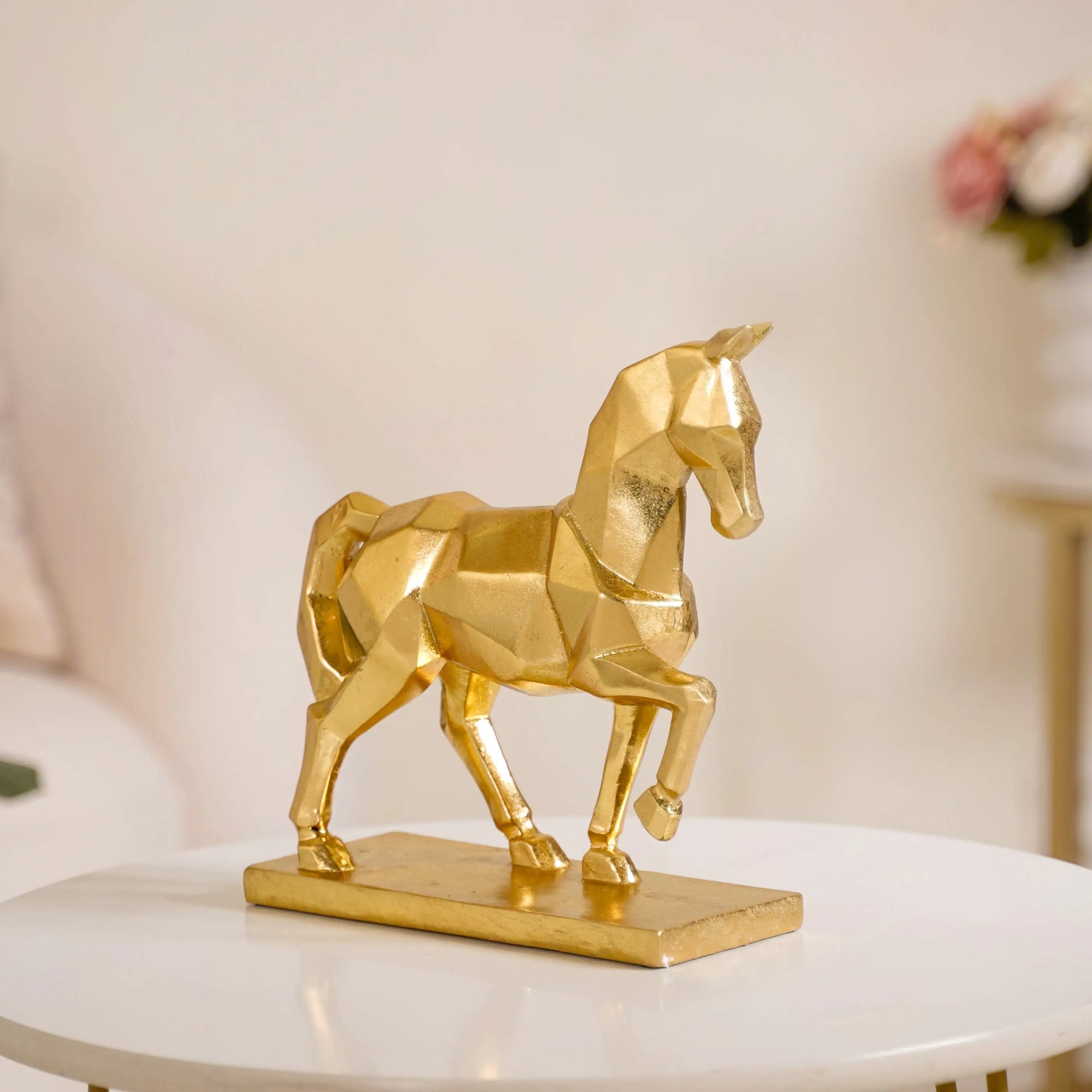 Discover the exquisite elegance of our golden resin horse showpiece, a captivating decor masterpiece merging artistry with a striking geometric structure. Meticulously crafted, the resin showpiece captures the majestic essence of a horse within a contemporary geometric design. The radiant golden hue adds opulence and refinement, making it the focal point of your decor. The geometric structure not only infuses modernity but also ignites visual intrigue, fostering conversations. Whether on a shelf, tabletop, or mantelpiece, it enchants art enthusiasts and enriches decor collections.