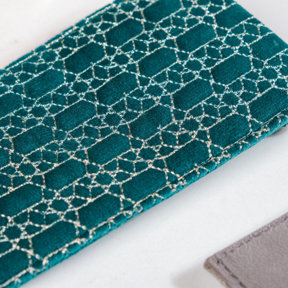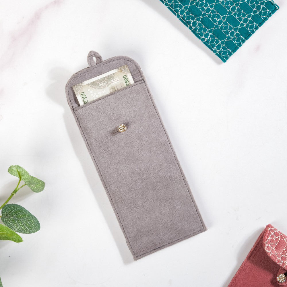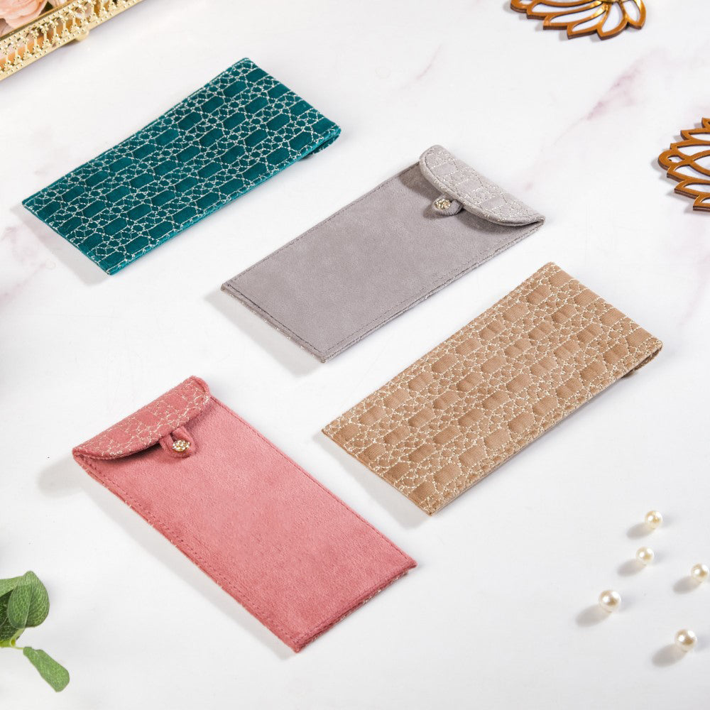 Festive occasions call for special gifts and the festive envelope set can make the purpose of gift-giving extra special. Expertly handcrafted from high-quality velvet material, the festive envelopes are embellished with intricate golden zari work and abstract patterns for a glamorous aesthetic appeal. The envelope set features 4 festive envelopes in dark green, pink, beige, and grey colours. Each envelope comes with a stone-studded metal button to keep the contents of the envelopes safe and secure. You can use them as invitation envelopes to invite your guests to celebrate a festive occasion together.