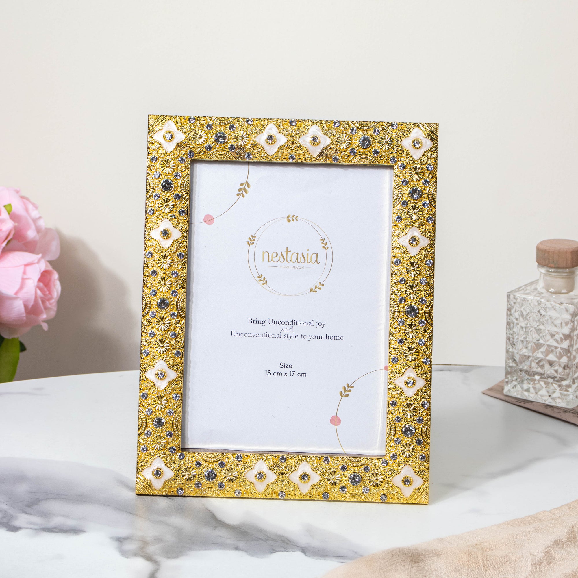 The rectangular photo frame is the perfect case to house such festive moments of life. The photo case has bright, yellow-tinted borders, having abstract motifs inlaid on each. The tiny silver beads give off a vintage vibe, making the photo frame an aristocratic addition to one’s room décor setting.