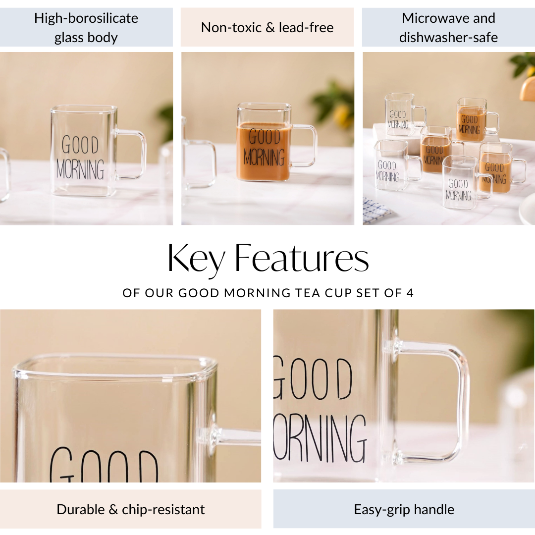 Design: Each cup is crafted from high-quality borosilicate glass, known for its resistance to temperature changes and everyday wear. The transparent body features clean, smooth edges and a sturdy base, giving it a refined yet durable feel. The handle is constructed from the same clear glass and shaped into a bold rectangular form that blends seamlessly into the cup’s body. This geometric silhouette not only adds a touch of modernity but also ensures a comfortable, ergonomic grip. The cup is fronted with the words “GOOD MORNING” in a neat, minimalist font, adding a cheerful and intentional design detail without overwhelming the overall look.