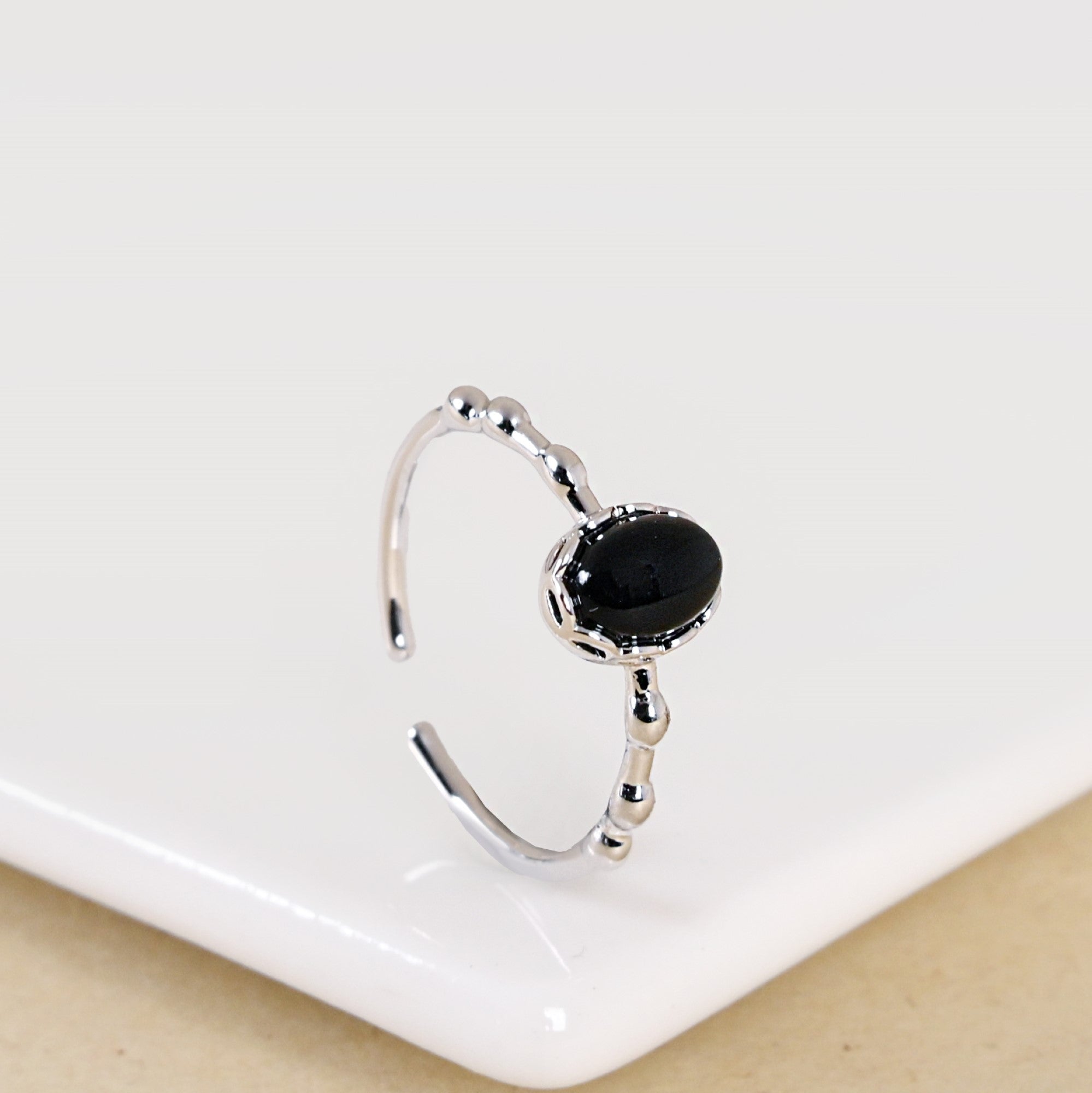 Drenched in mystery and elegance, this gothic silver ring is the ultimate statement of dark sophistication. At its heart, a striking black stone gleams with an enigmatic allure, securely cradled by silver-toned metal clasps that enhance its bold presence. The band itself is adorned with intricate self-designs, adding a touch of vintage artistry to its gothic charm.