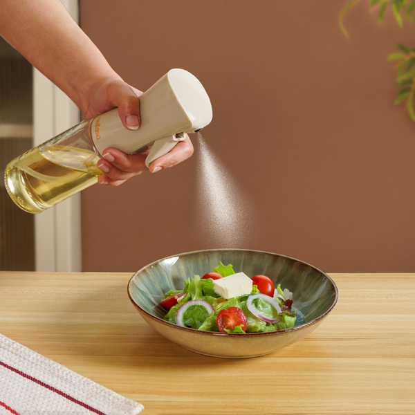 Design: Made with a transparent glass bottle body, this oil dispenser features a softly contoured form with visible measurement markings for easy monitoring. The beige PVC spray lid delivers a wide fan shaped mist for even coverage, helping distribute oil smoothly across pans and food. An integrated bottom reaching straw supports efficient dispensing, while the ergonomic side handle and leak resistant sealing lid ensure neat, fuss free everyday use.