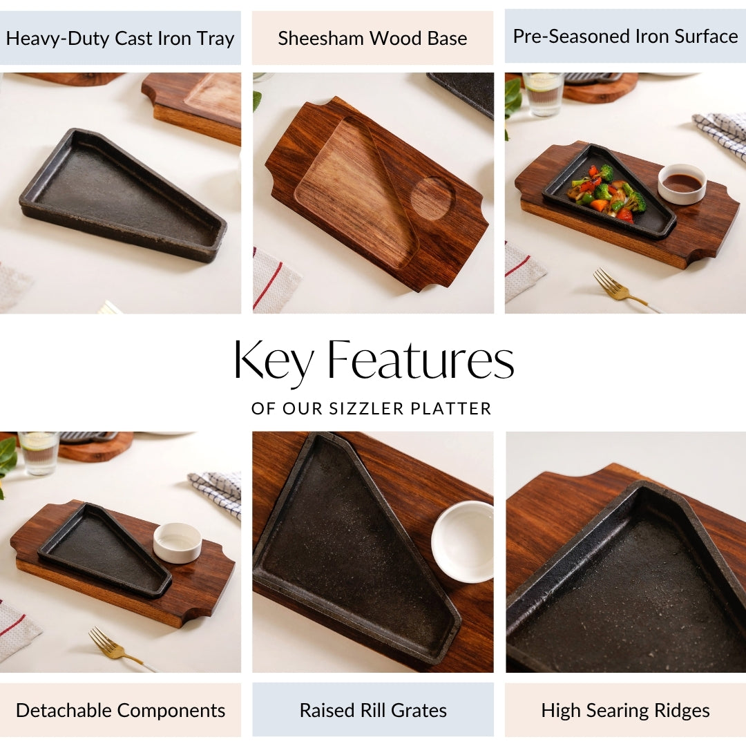 Your table is about to get hotter! Our cast iron sizzler plate, with its elegant Sheesham wood base and handy ceramic bowl, brings restaurant magic home.