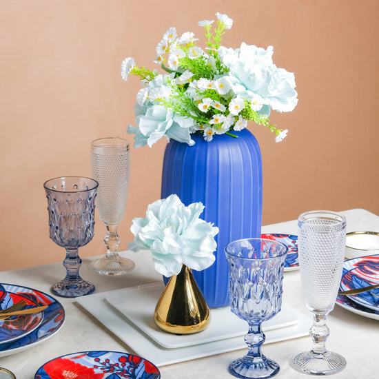 The textured glassware set showcases exquisite craftsmanship that'll simply take your breath away. While the blue translucent colour makes the glassware stunningly gorgeous, the round-shaped and wide-mouthed design makes it easy to clean without damaging the glassware. The premium-quality glass also makes the goblets quite sturdy, making them more functional. You can pair the blue crystal wine glass set with blue or white dinner sets and crockeries to create an elegant and highly sophisticated table spread for a grand celebration.