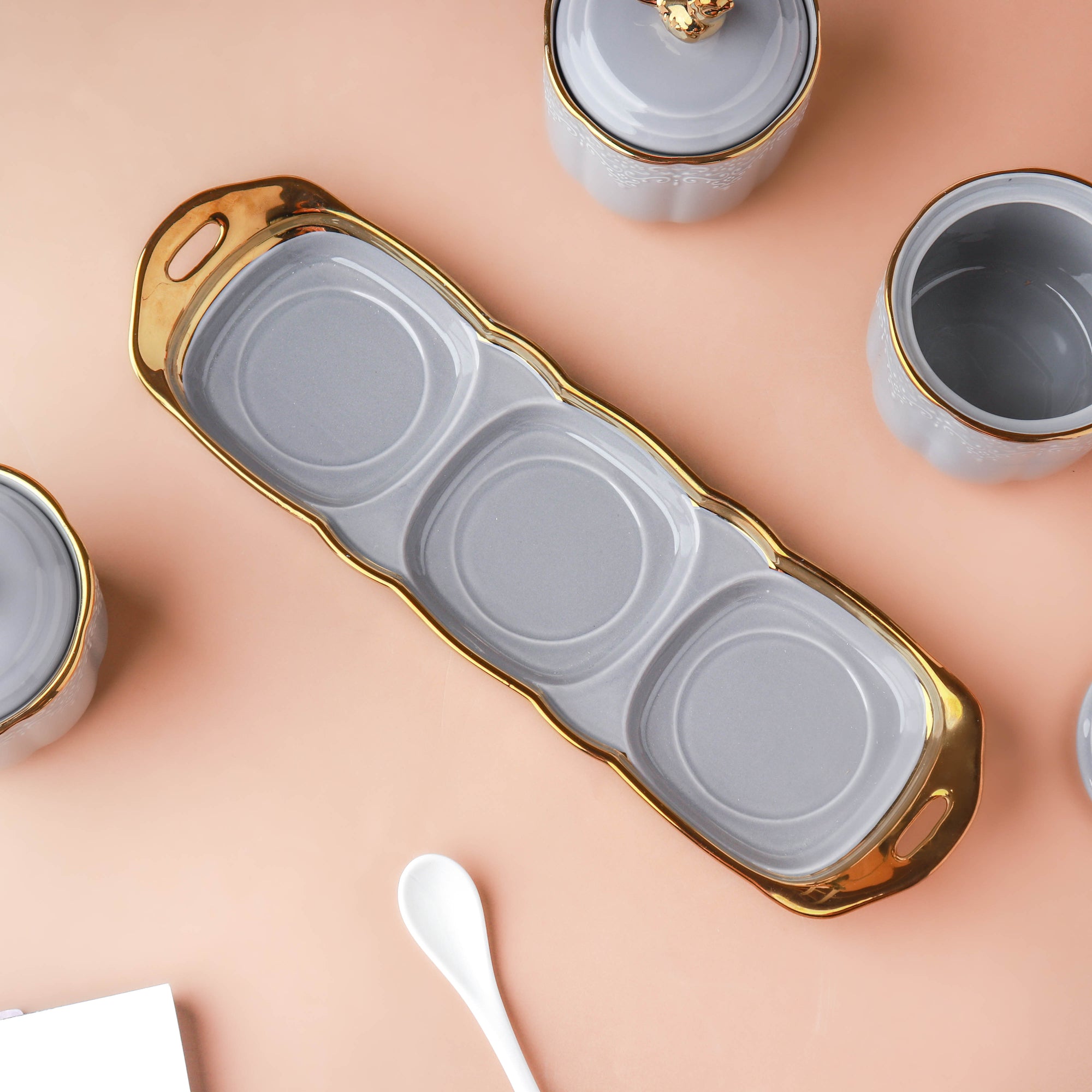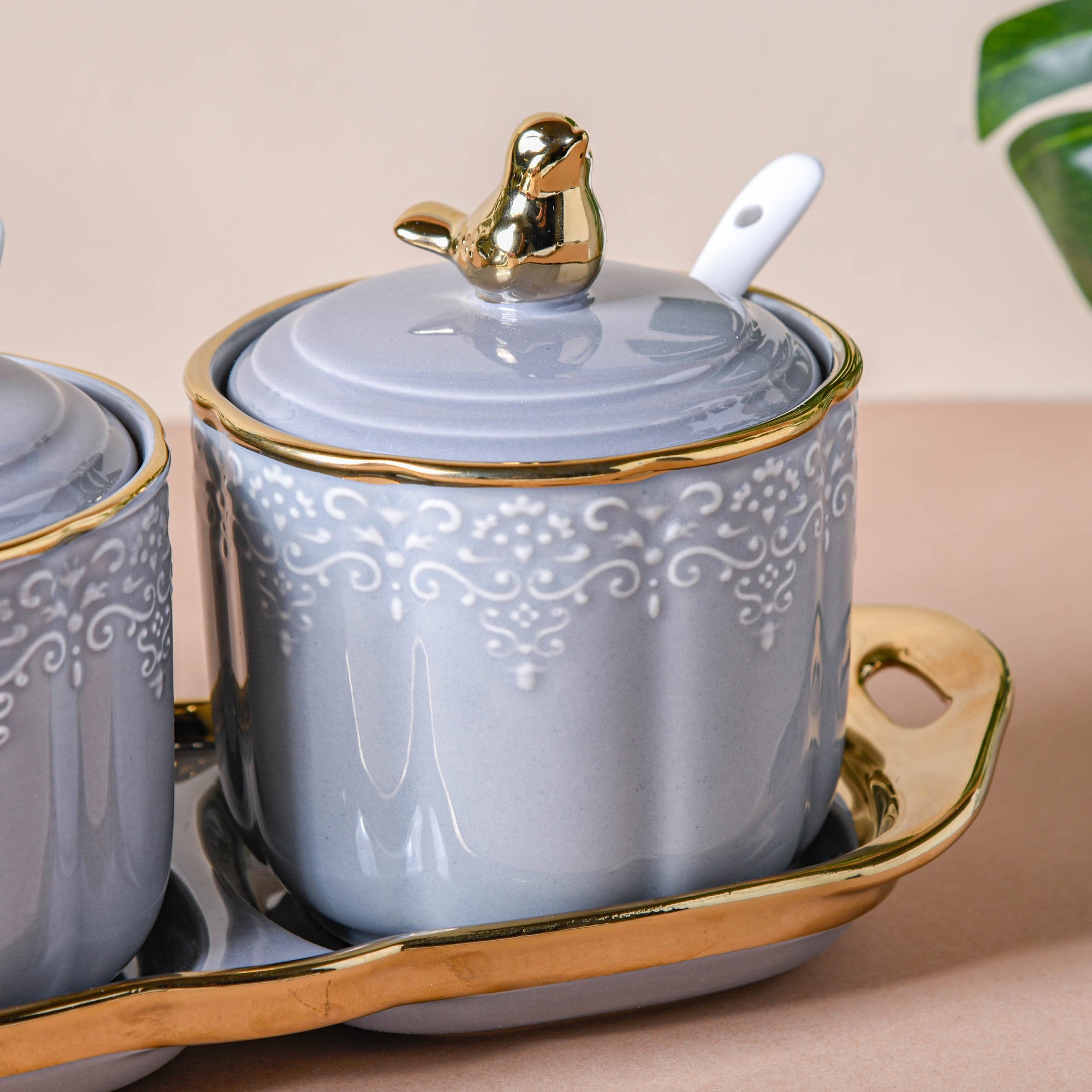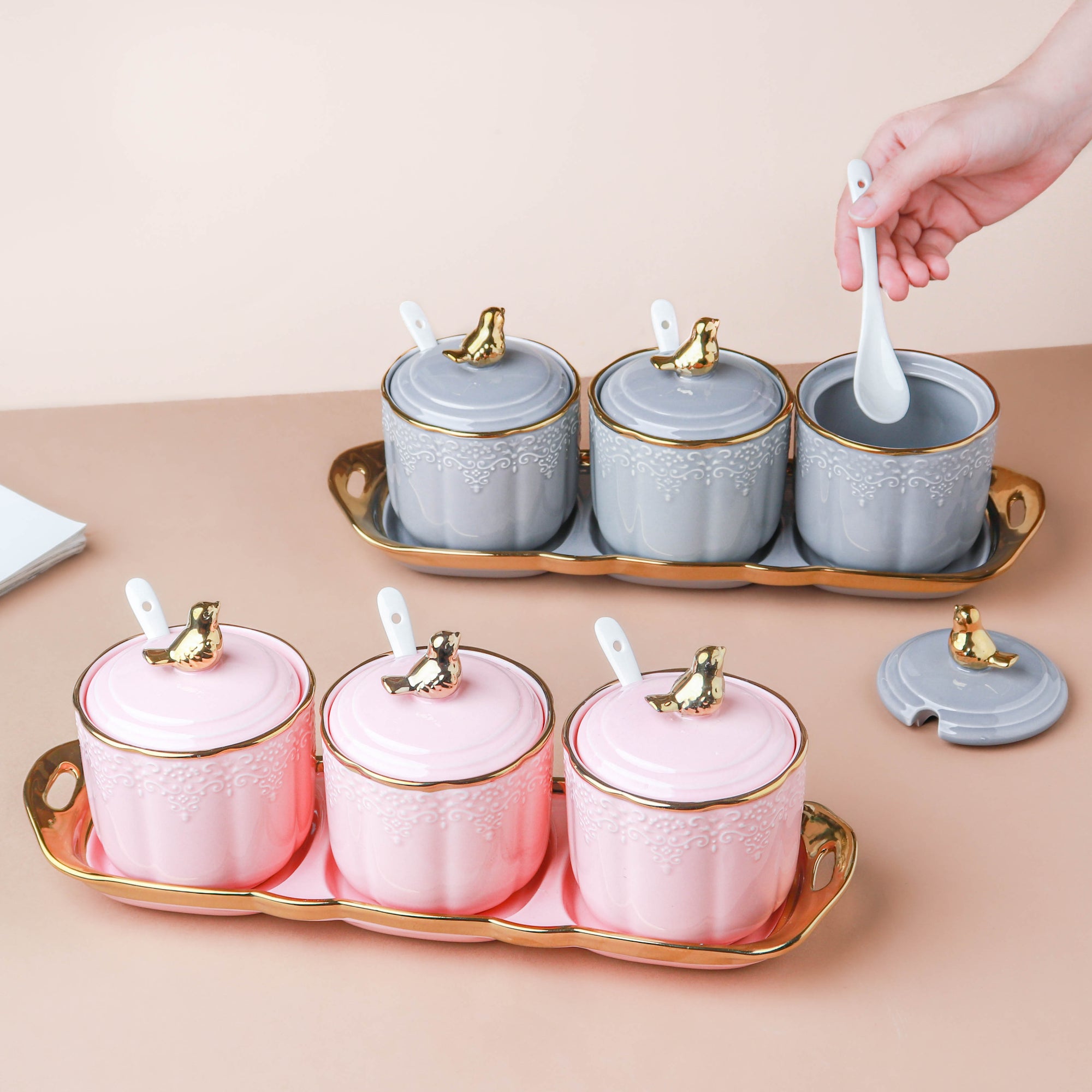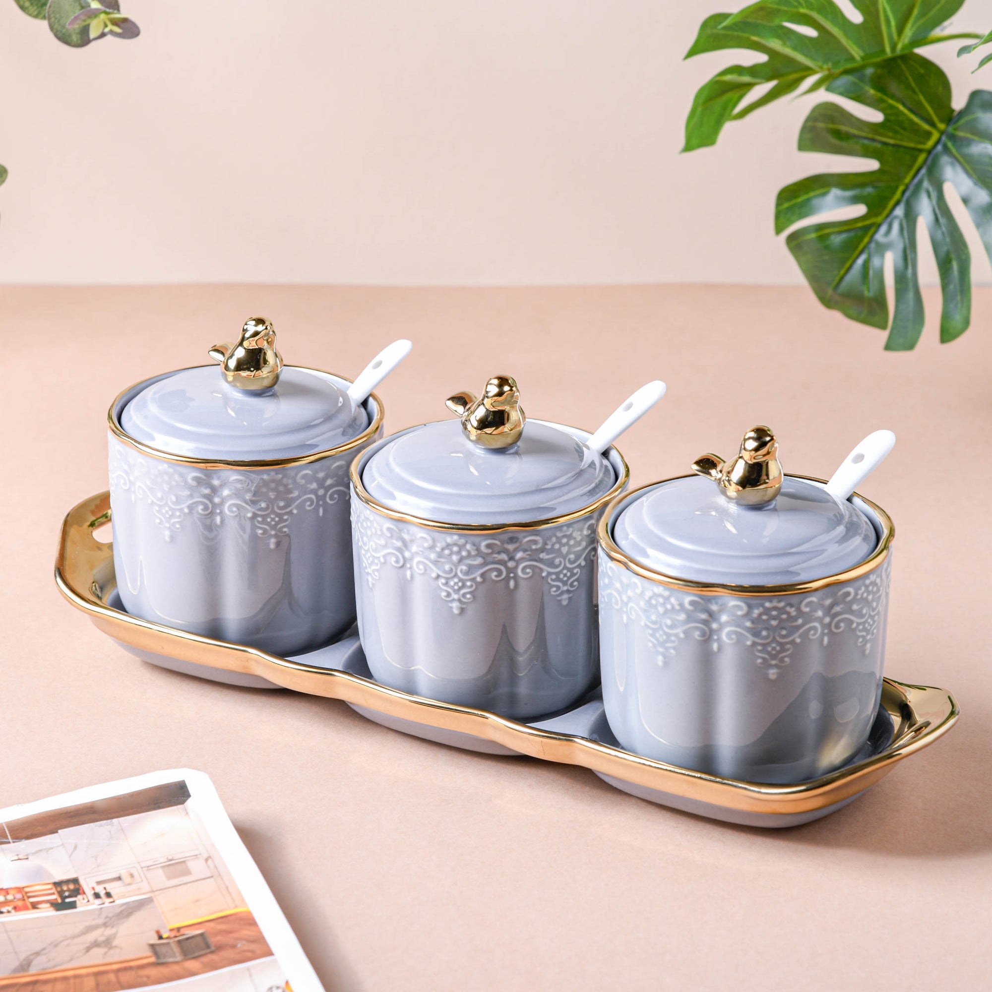 Capacity: 250ml Color: Ash-gray and gold Material: Ceramic and metal Products Included: A set of 3 spice jars with lid and spoon; 1 holding tray Style: FC57C22