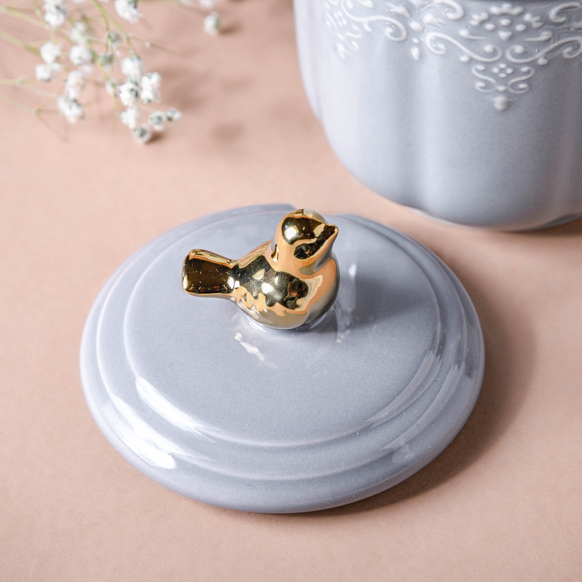 Elegance in sweet harmony with minimalism is what the spice jar set relays to one’s visual senses. Coming in a set of three, the spice jars wear bright, pastel tones. Each jar is provided with a spoon and cover lid, with a little goldfinch resting on the lid's top. The ceramic jars have a thick, gold-tint border along the rims. Plus, there is a tray with in-built seats for the jars to rest safely, without falling over. One can use the condiment jars to serve chili vinegar, pickles, different sauces, or other taste enhancers on the dining table. Nestip: The spice jar set can be an aesthetic gift to a friend or relative on the occasion of a housewarming. Size: Tray - 10cm B × 34cm D × 3cm H Spice jar (with lid) - 9cm D × 12.5cm H Spoon - 13cm L