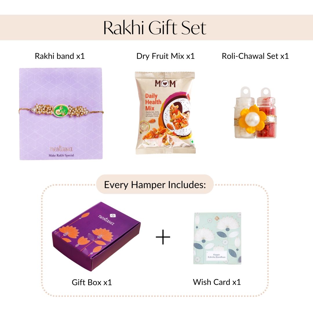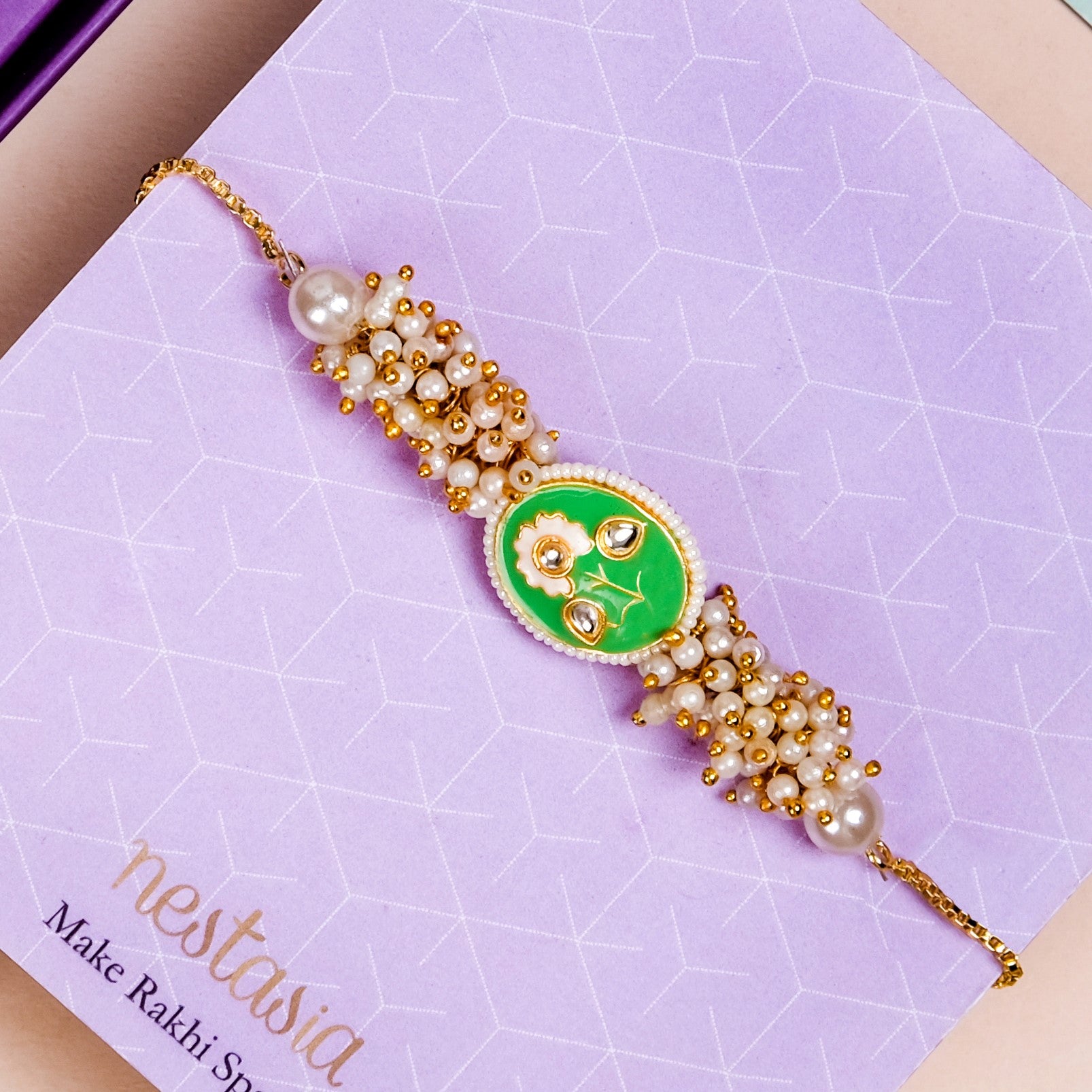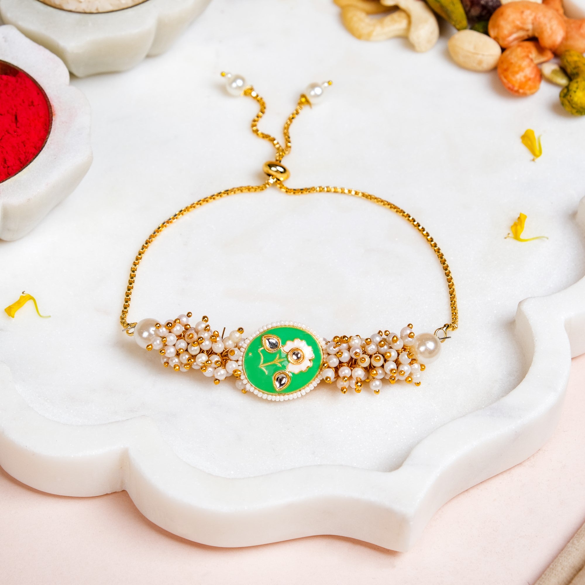 Pearls to the rescue! Our beautiful green rakhi set is the season's perfect gift for your brother. It carefully mixes traditional style with contemporary design in a way that the oval centre has a beautiful minimalist flower embedded with kundan stones. The enamel at the centre is green and is bordered with shiny white beads. The golden adjustable chain makes it easy to tie comfortably on any wrist, and the pearl-tipped ends add an extra touch of beauty. The rakhi comes as a complete part of a set which also includes 1 dry fruits packet, 1 wish card and 1 roli-chawal bottle set.