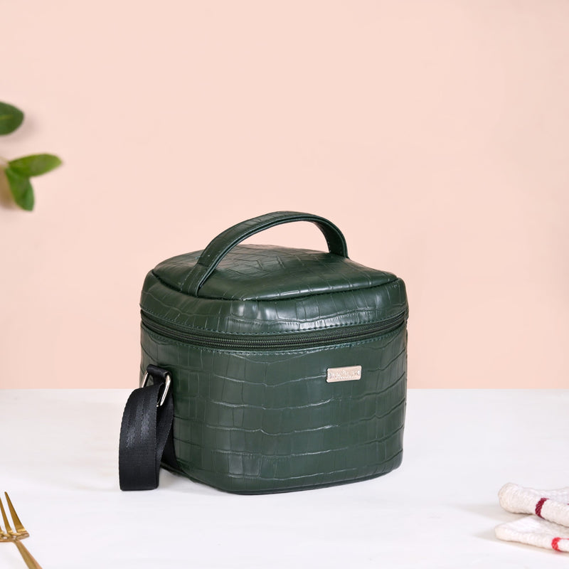Design: Crafted with a green croco-patterned exterior, this lunch bag is designed to be both fashionable and functional. The cushiony outer body offers a premium feel, while the stitched top handle and adjustable shoulder strap make it easy to carry. The smooth chain and dual zipper closure ensure quick access and a secure fit for your meals.