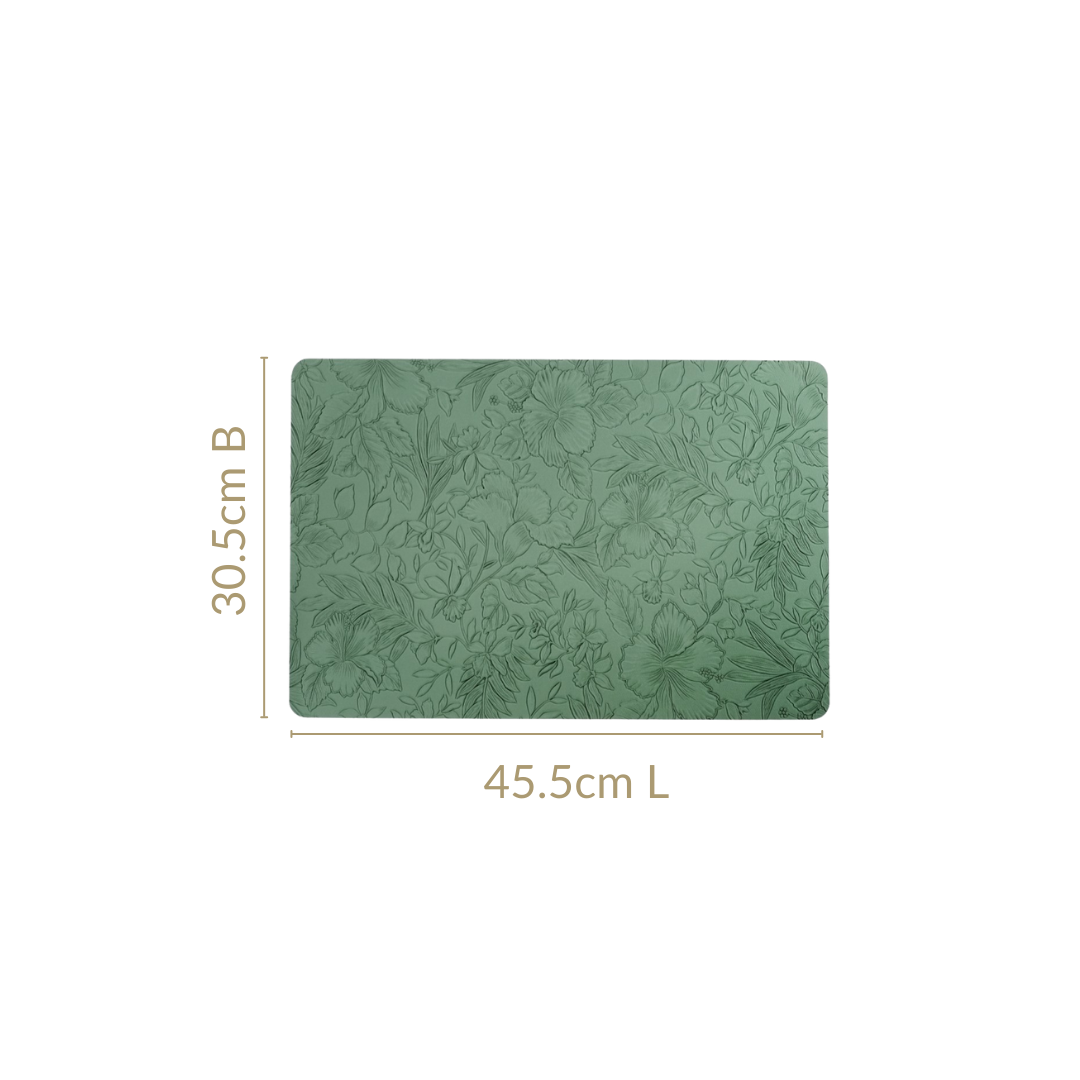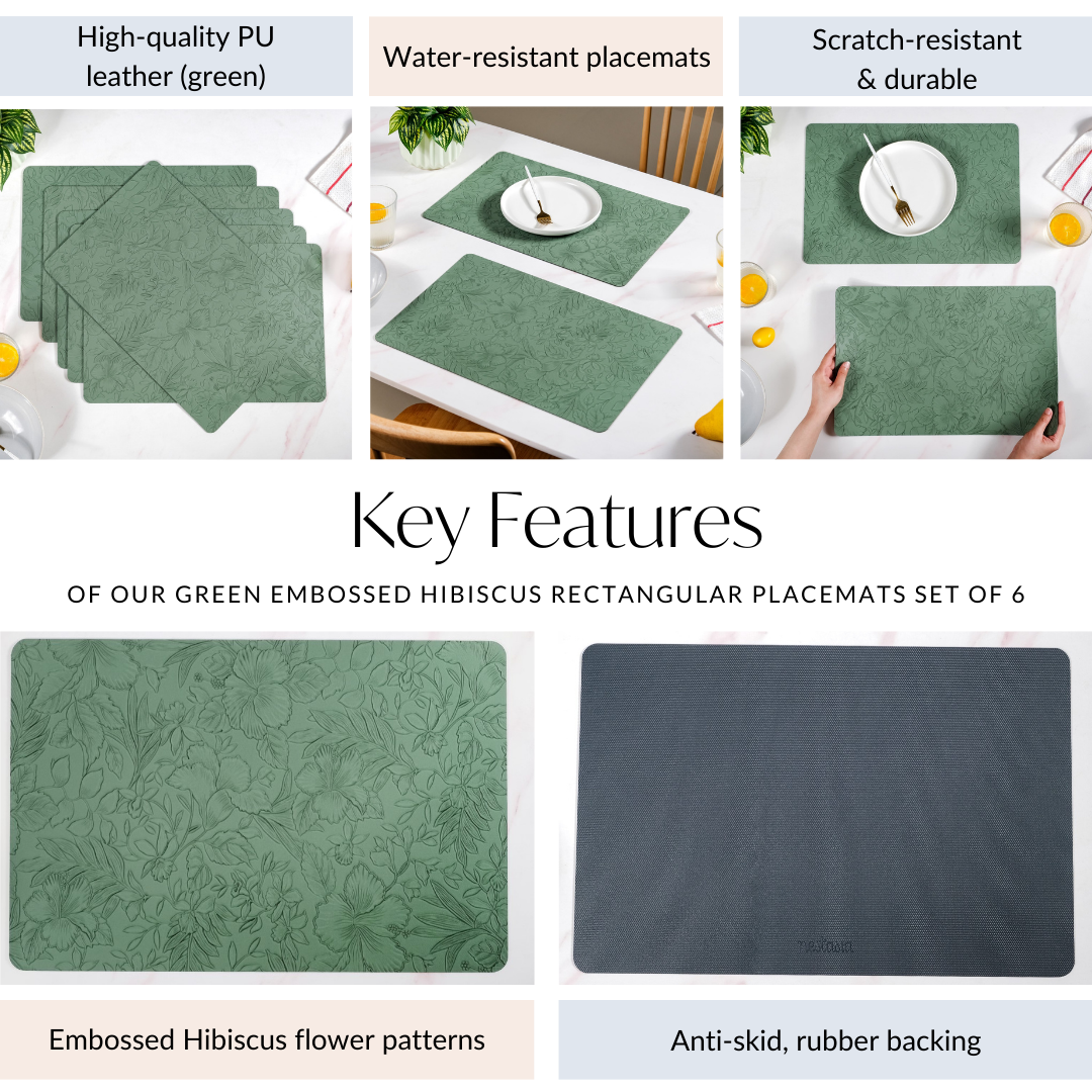 Design: Featuring embossed Hibiscus flower patterns, these dining table placemats add a touch of refined charm to any dining setup. The rich green hue complements various table settings, from modern to traditional. With a smooth PU leather surface, they provide a polished look while ensuring easy maintenance.