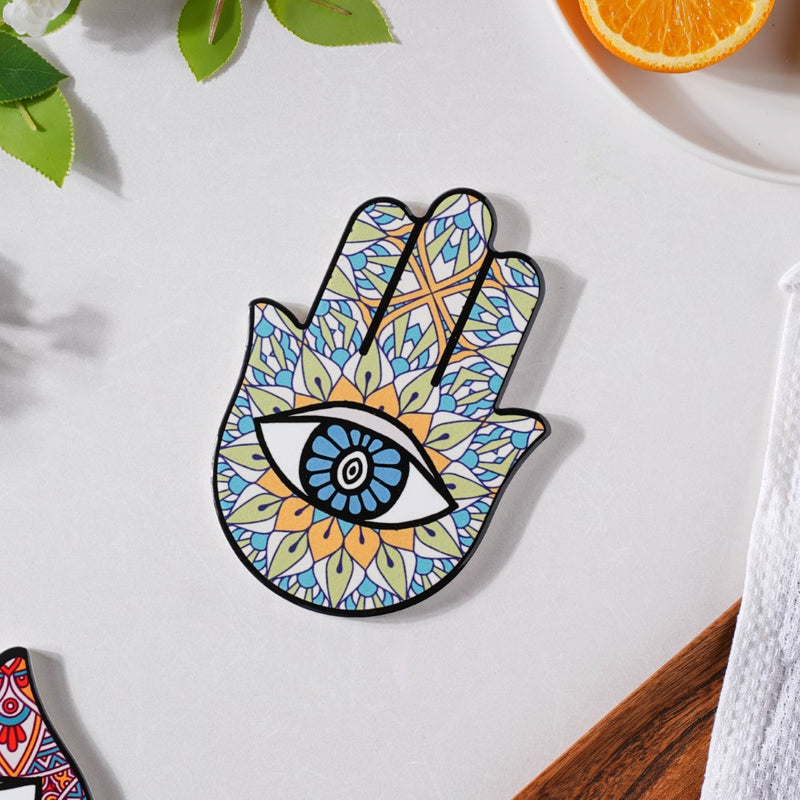 The Hamsa Hand has been used for many, many years as one of the earliest symbols in human history. It is said to have existed before all major religions, several of which eventually adopted it to stand for a particular component of their faiths. Globally, it spread until it was recognizable everywhere. Typically, it serves as a charm for luck. One can display this coaster, which is a representation of cosmic powers in any corner of the house to welcome prosperity and positivity. Place the coaster on the dresser, side table, or a corner of the house dedicated to age-old art forms, rather than simply placing it on the table for resisting heat and preventing spillage on the table surface. The hand of Hamsa is a representation of various chakras and elements. They are: