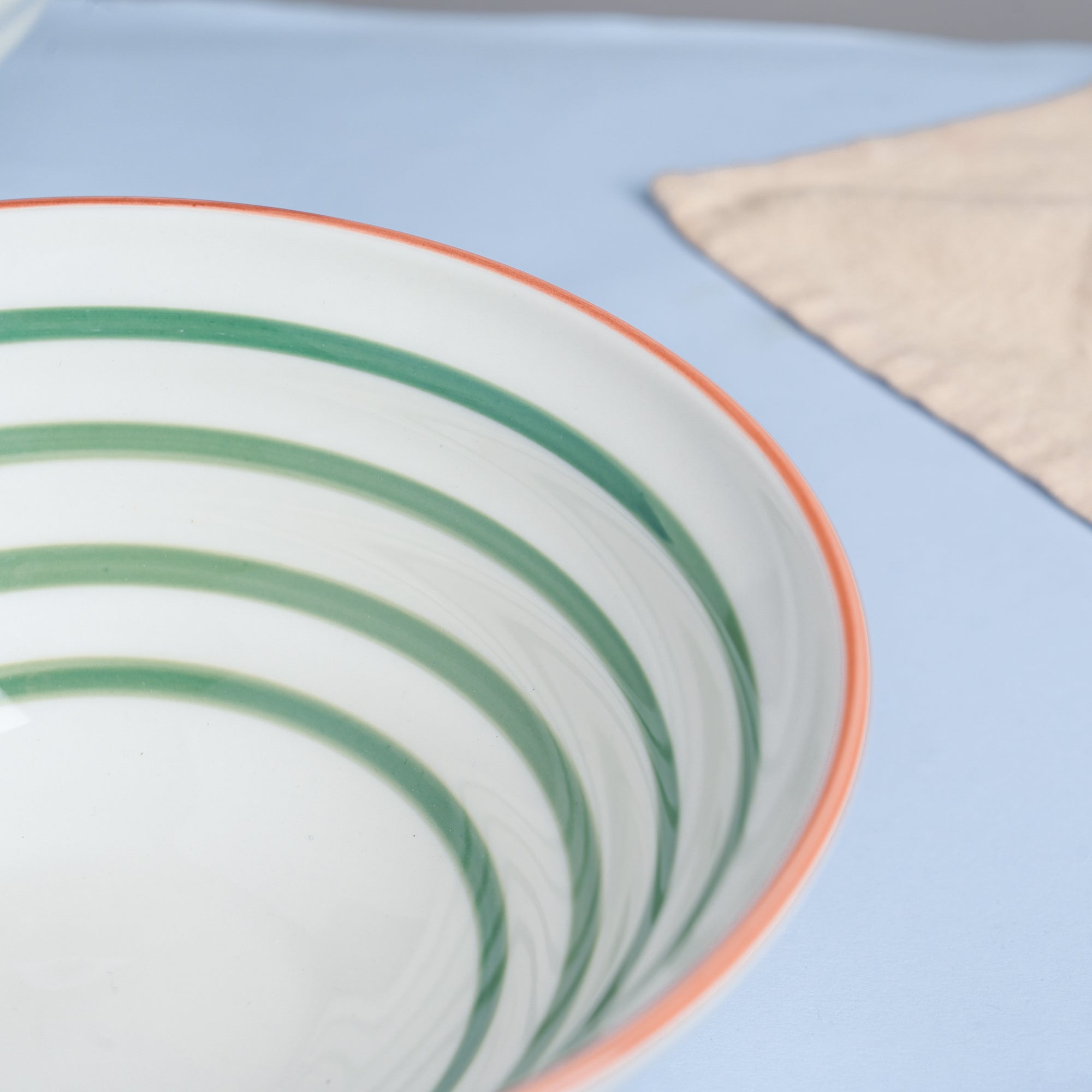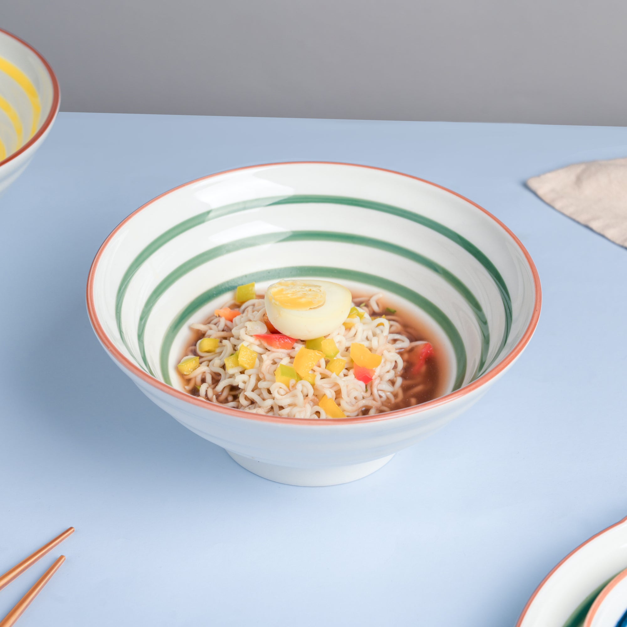 The expertly crafted ceramic bowl has a gracefully textured outer surface and bright green-colored ring patterns on the inside. The bowl can be used as a serving bowl during luncheons or as a ramen bowl for supper or as a delish morning breakfast. The bowl will be the perfect addition to any modern table setup and is sure to steal the gazes of guests.