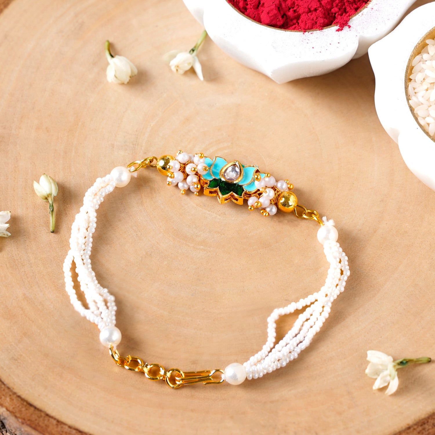 Green Kundan Lotus Rakhi Gift Set For Bhaiya Bhabhi