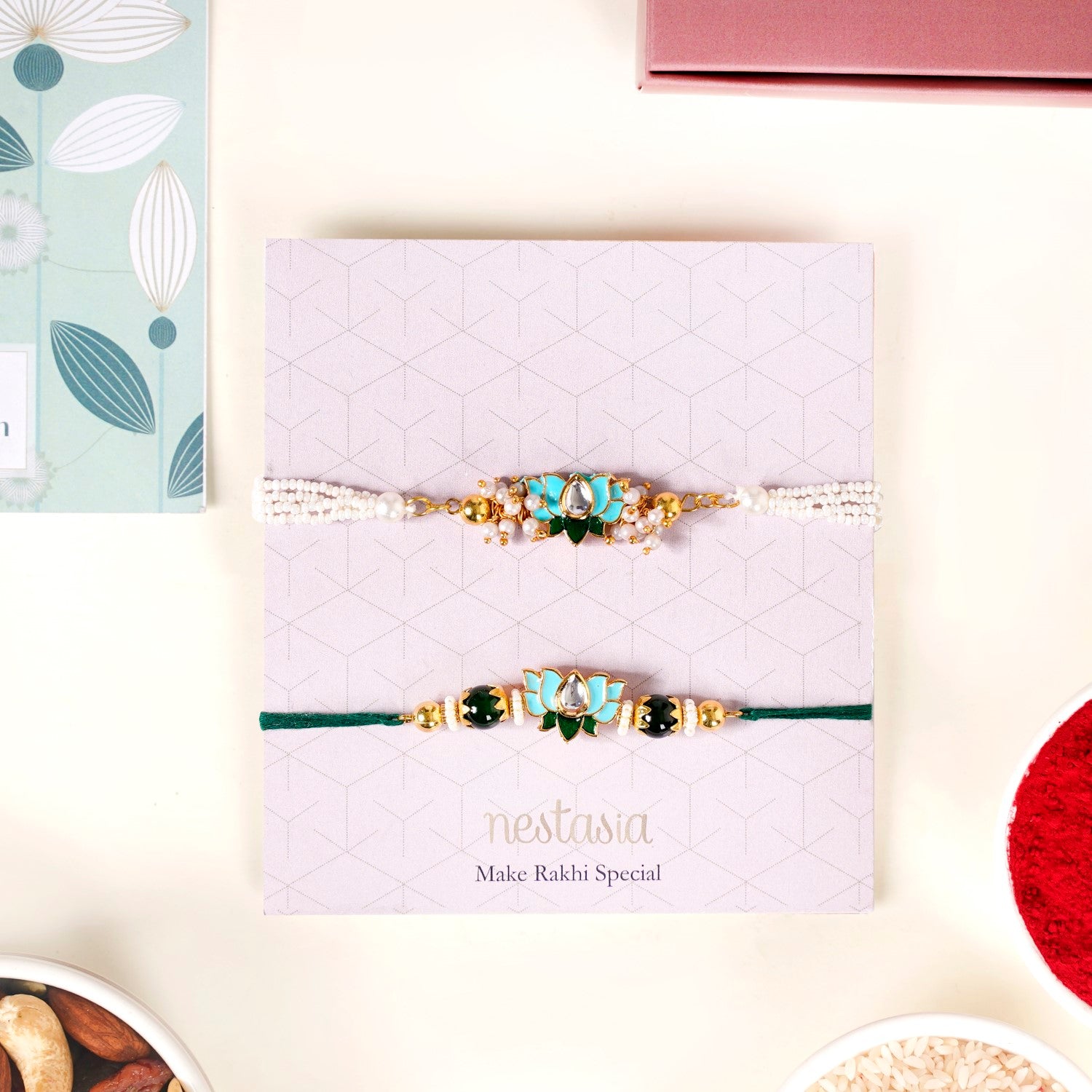 Embrace tradition with our exquisite Rakhi hamper featuring 2 green lotus Rakhis embellished with artificial beads, meenakari, and kundan stone designs. One Rakhi, a symbol of brotherly love, boasts a traditional green thread, while the bracelet Rakhi for your sister-in-law dazzles with white pearl strings and a stylish metal hook. Crafted with care, each Rakhi signifies familial bonds and timeless elegance, perfect for celebrating Raksha Bandhan. Complete your festivities with a roli-chawal set for sacred rituals, and a pack of delicious dry fruit mix for indulgence, and a heartfelt greeting card, all presented in an elegant gift box.