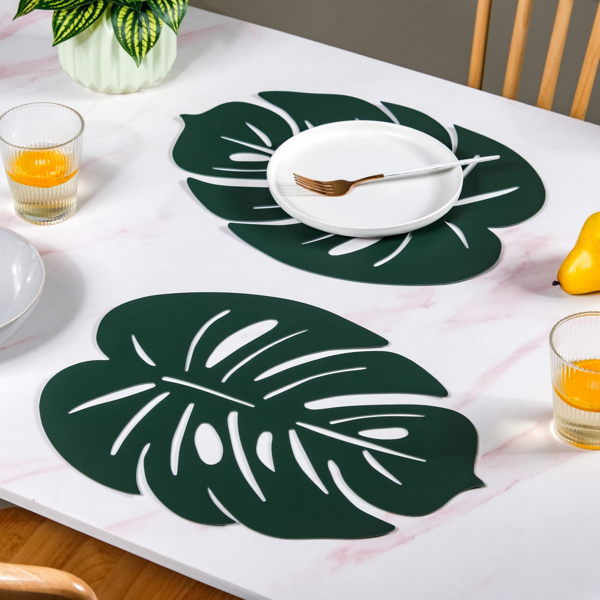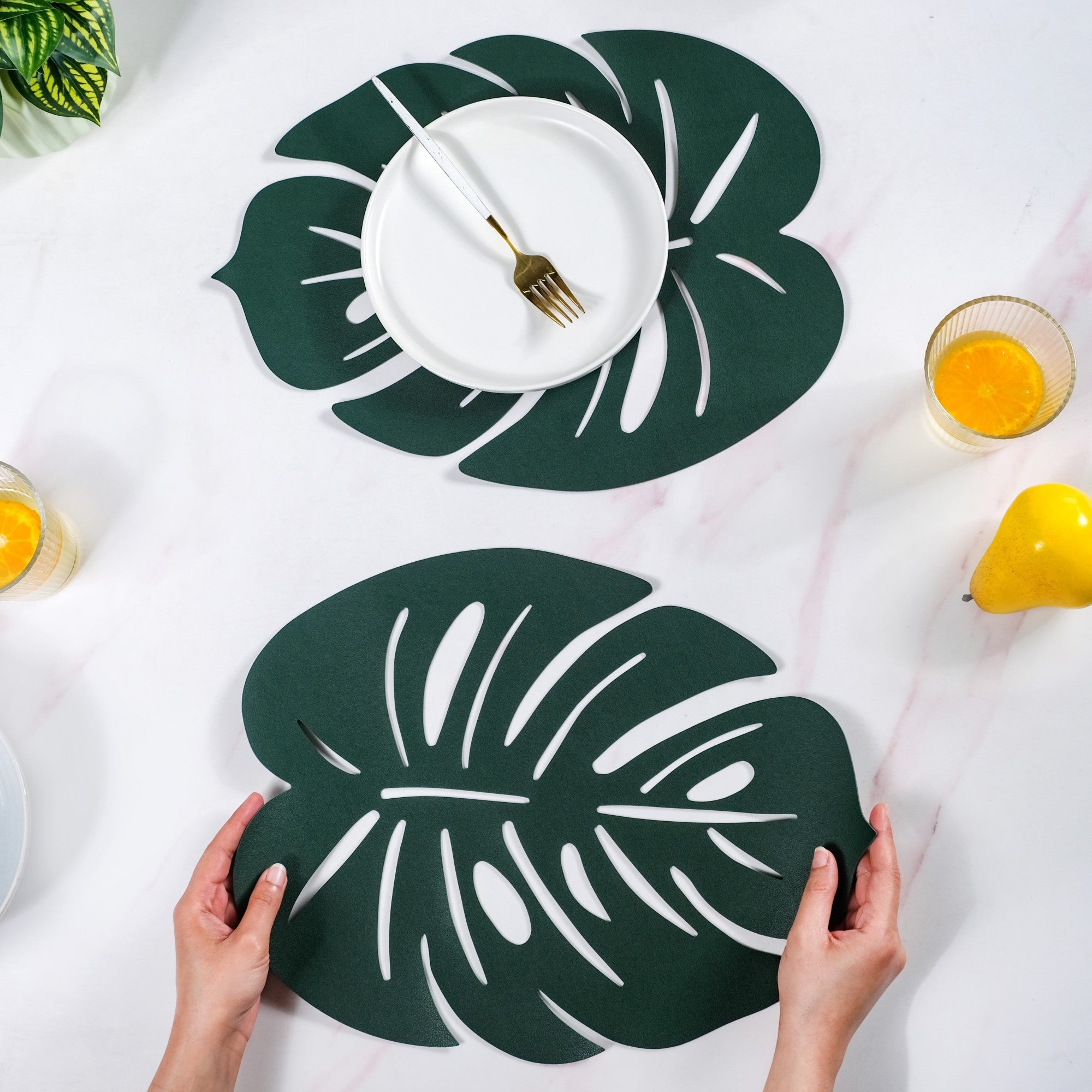Bring a tropical charm to your dining table with a set of 6 Monstera leaf-shaped placemats. The intricate design and rich green hue create a refreshing tablescape while offering durability for everyday use.