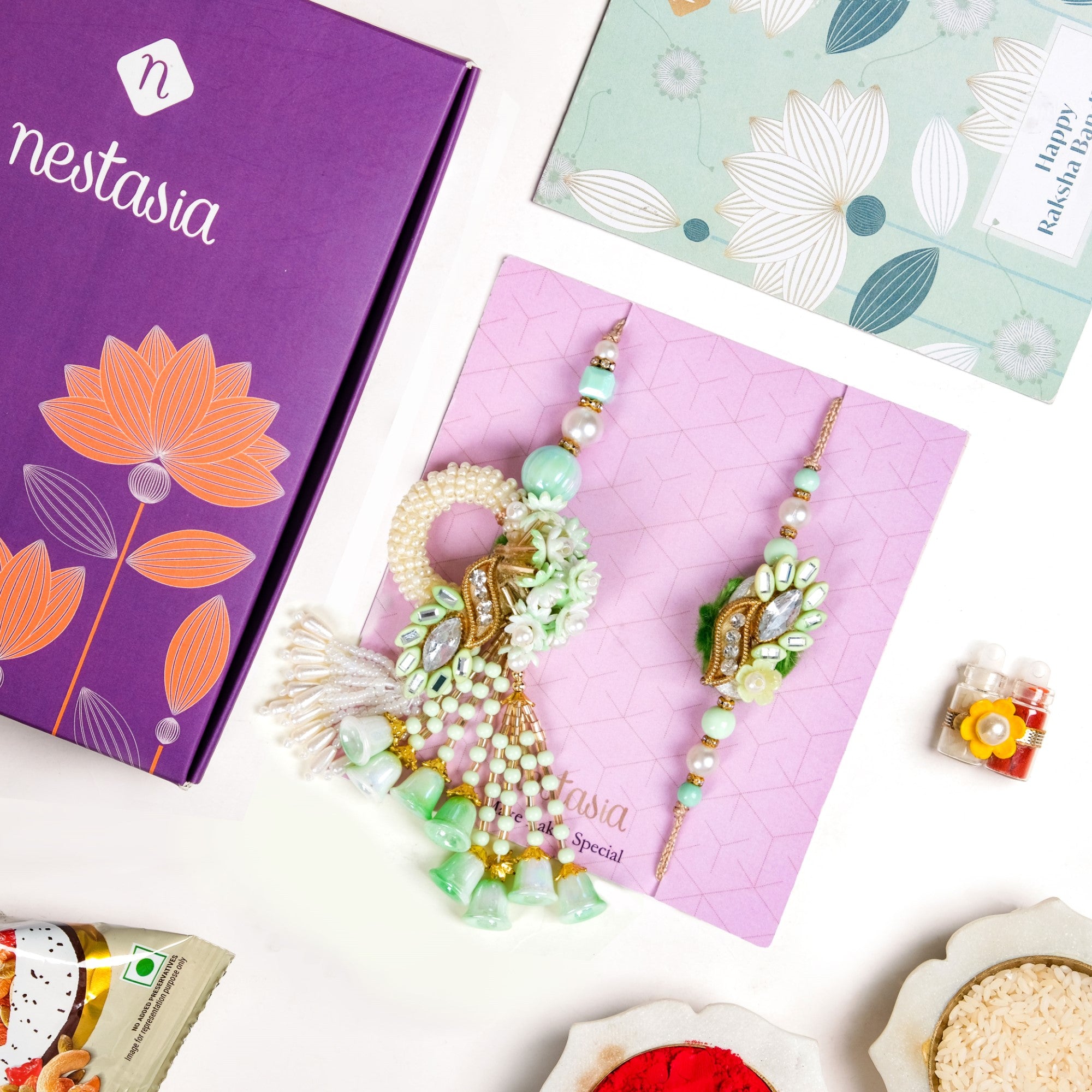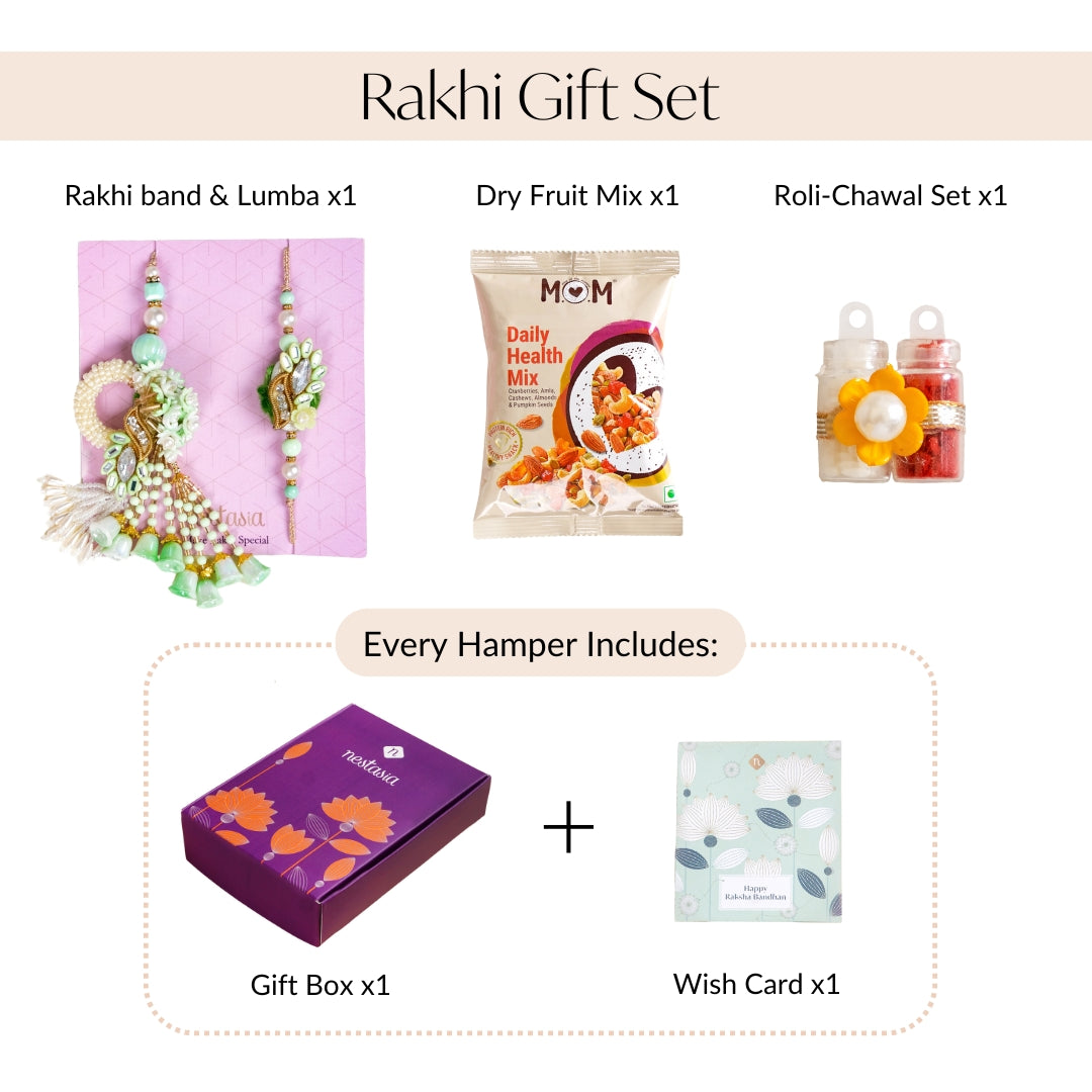 Inspired by the charm of blooming green florals and the timeless elegance of pearls, this soft green Rakhi and Lumba set beautifully captures the essence of pastel sophistication. The Rakhi features a striking central stone framed with intricate gold detailing and complemented by delicate white stones, creating a graceful and eye-catching design. The coordinating Lumba echoes the same refined aesthetic, making it a perfect pairing for your sibling bond. Thoughtfully curated, the gift box includes one Rakhi, one Lumba, a packet of mixed dry fruits, and a heartfelt wish card, making it a complete token of love and celebration.