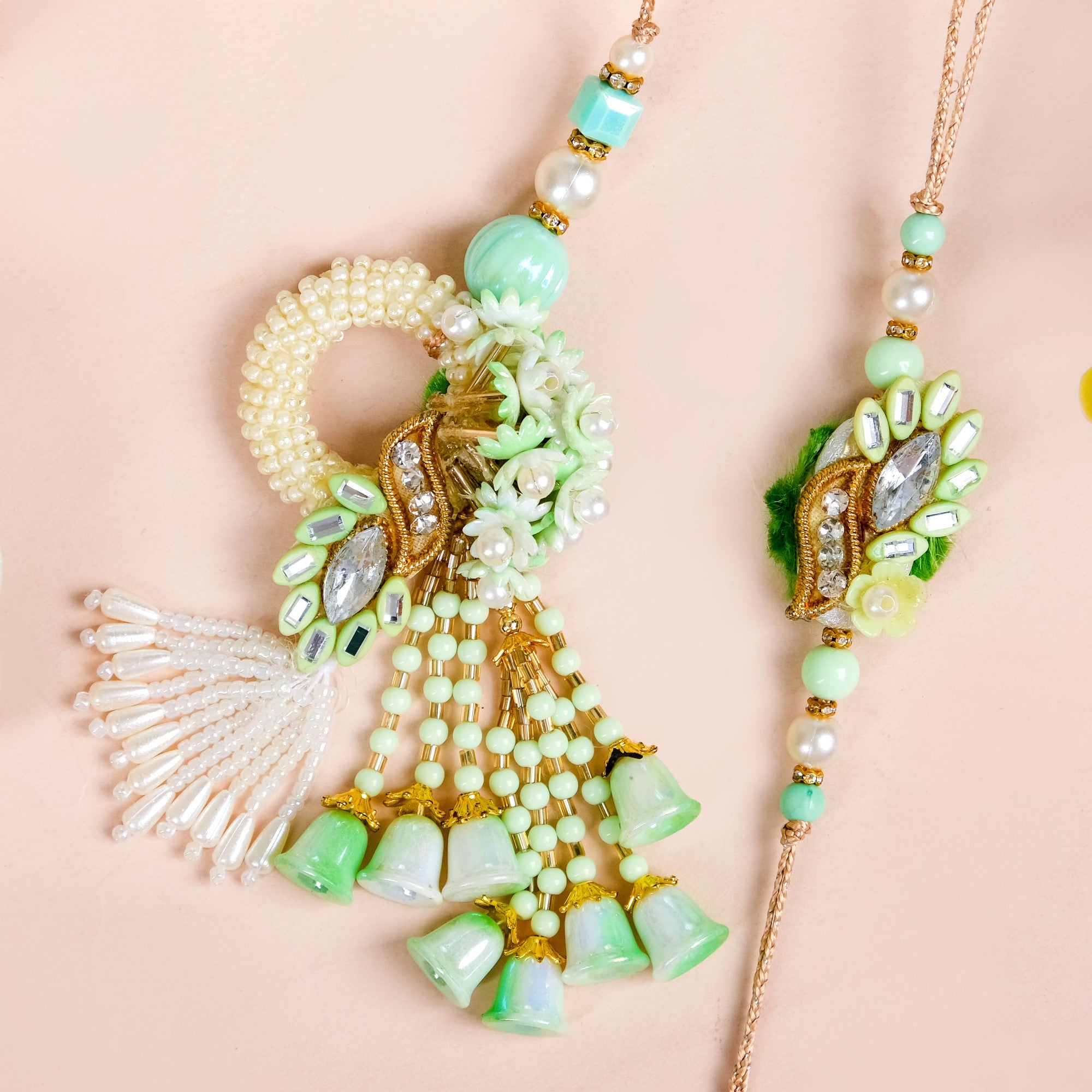 Green Pearl Beaded Rakhi And Lumba Set