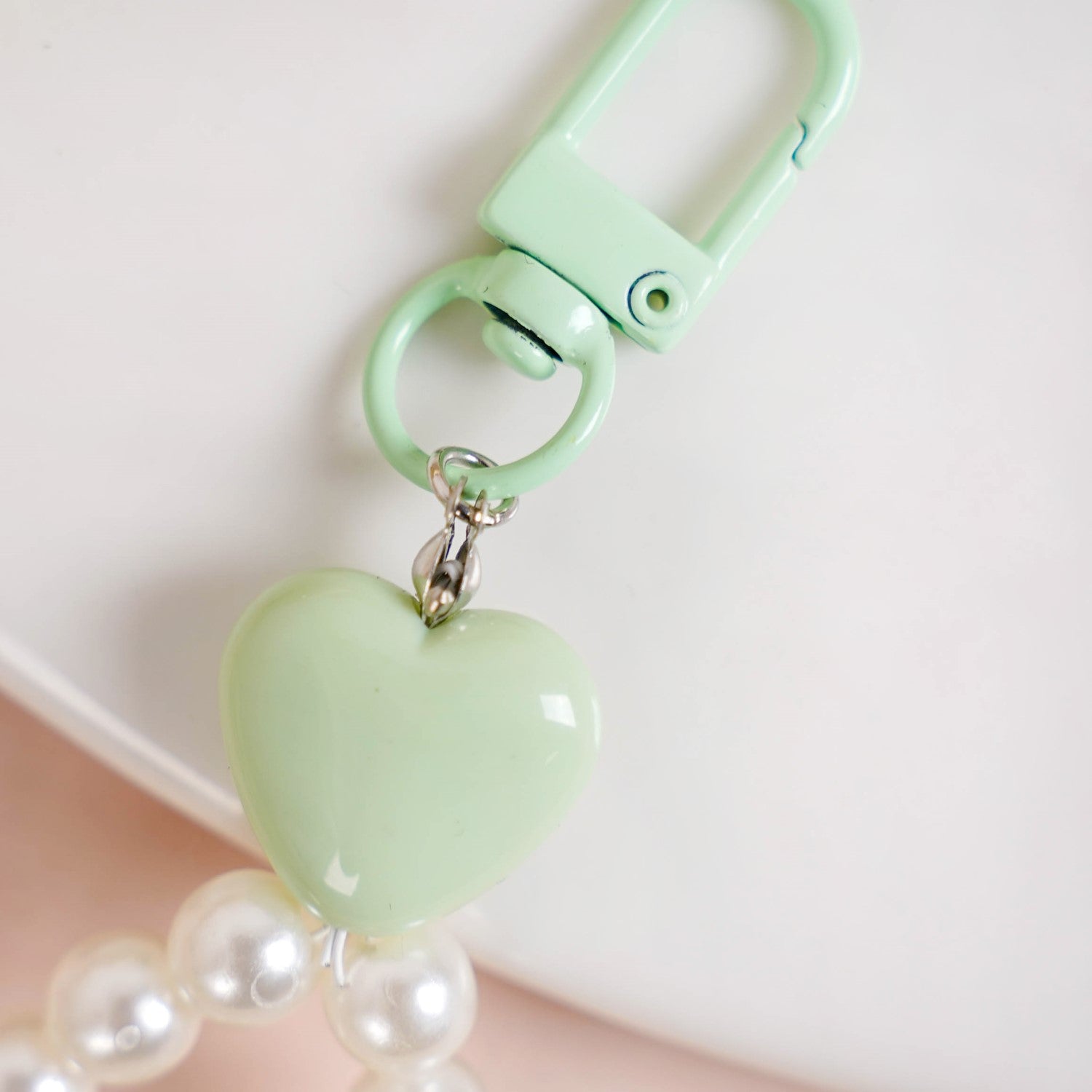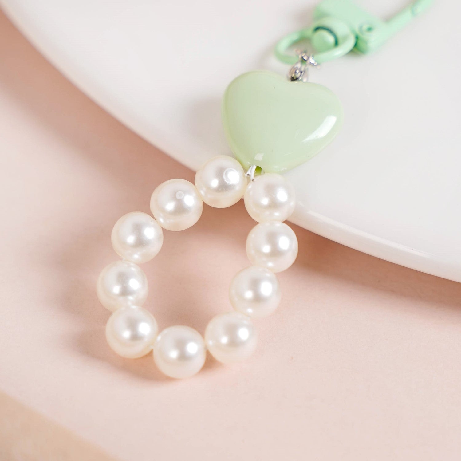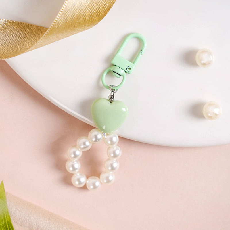This keychain is the perfect mix of function and flair making it a must-have fashion accessory for your everyday essentials. Crafted from the highest quality materials, this keyring features a sturdy swivel lobster claw clasp that makes it easy to slip onto your keys and securely hold them. But the beauty doesn't just stop there. Adorned with a mint-green heart that radiates charm and a loop of faux pearls, with their classic iridescent finish for a touch of elegance, this keychain is sure to stand out in any collection. Perfect for adding a bit of personality to your keys, it also makes a lovely bag charm, instantly enhancing your handbag or tote with a playful yet refined detail. Now that you know, there's only one thing left to do, Add this stylish piece to your cart today!