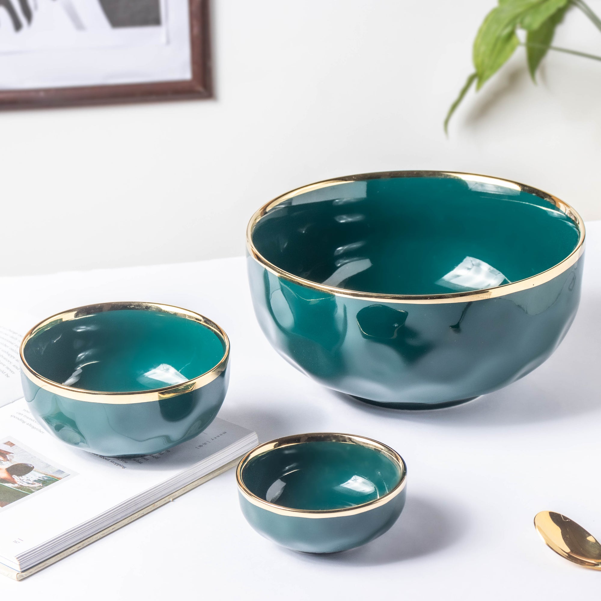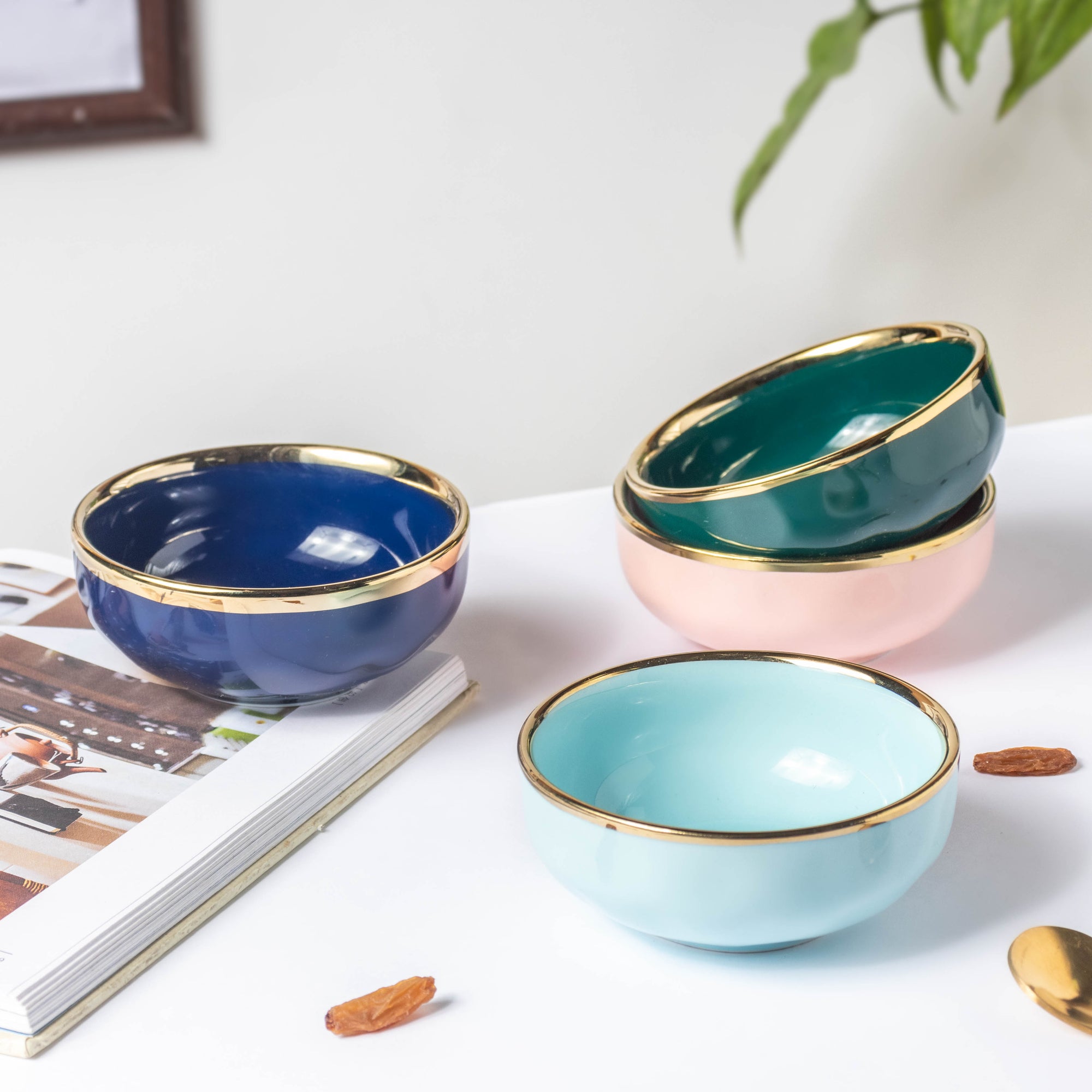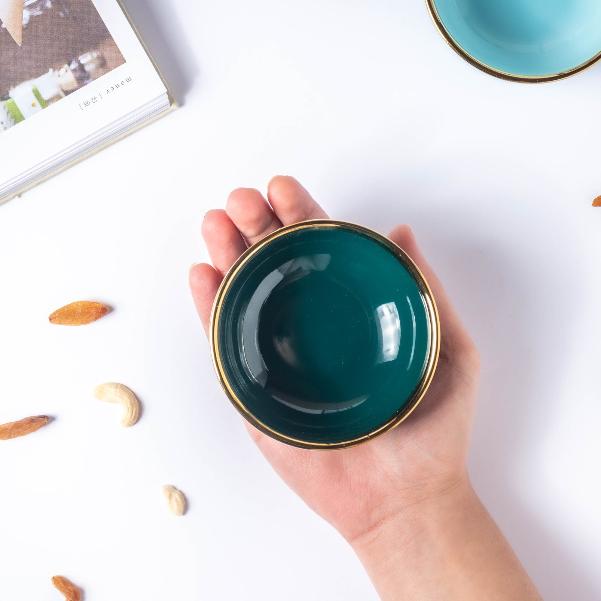 The bottle green bowl comes with a glazed-finish which lends a classy aesthetic to the modern and contemporary dinner set-up. The ceramic bowl is embellished with a gold rim which accentuates the aristocratic appeal. For a house party or a social get-together, bring home a few ceramic bowls to serve soups and stews to guests. Serve homemade dips along with delectable munchies in the Greenwave Ceramic Dip Bowl.