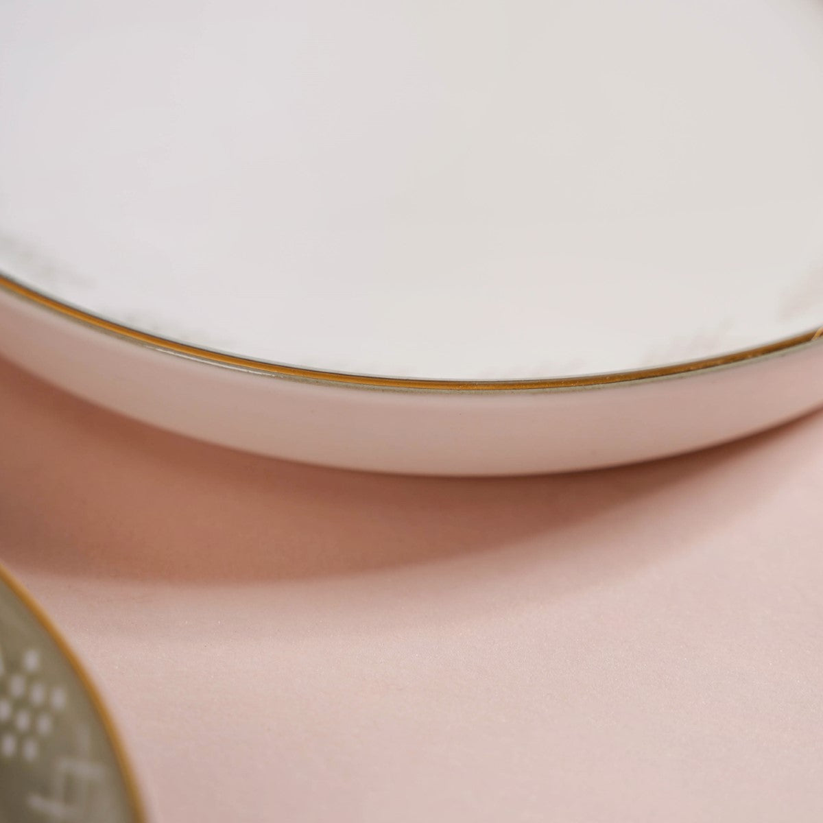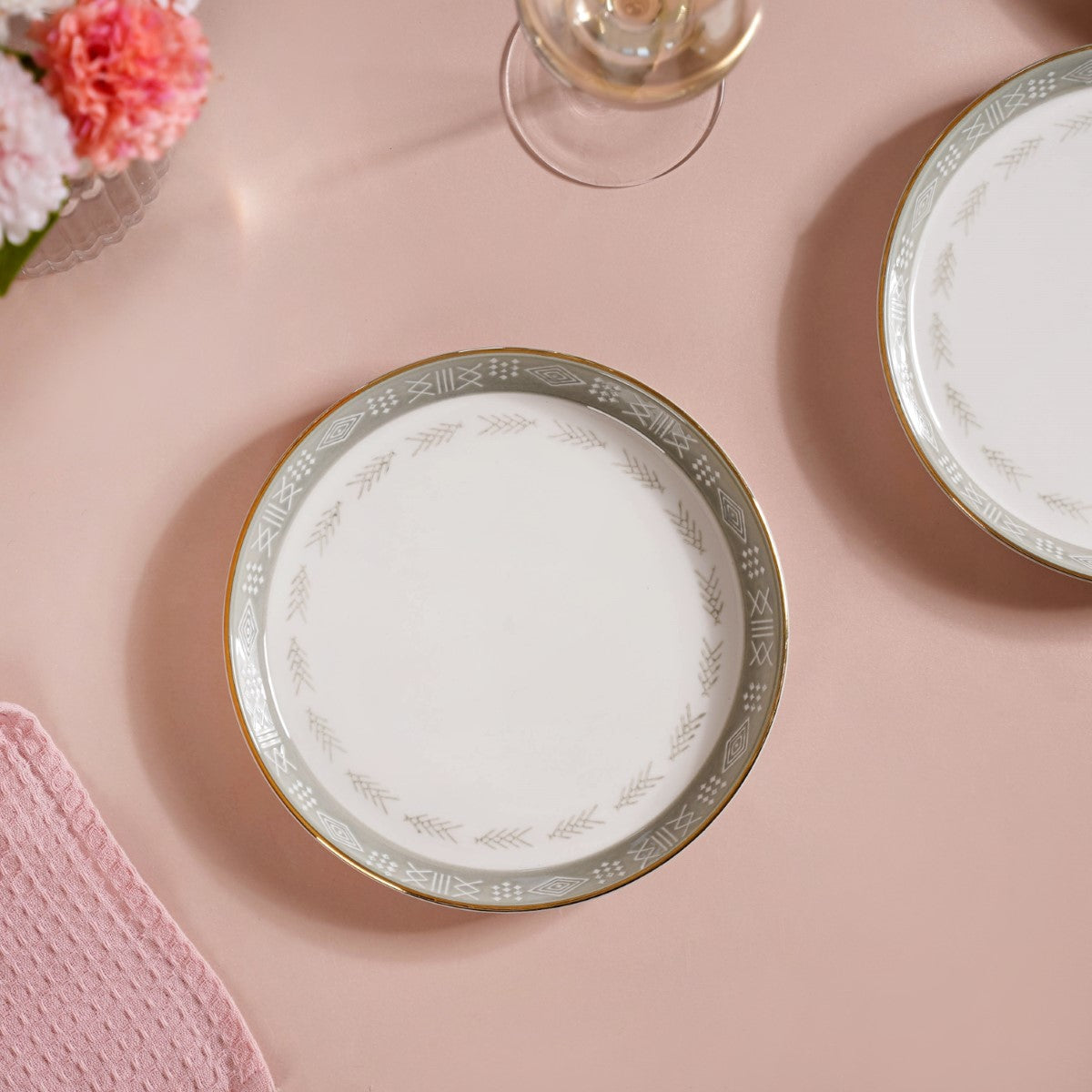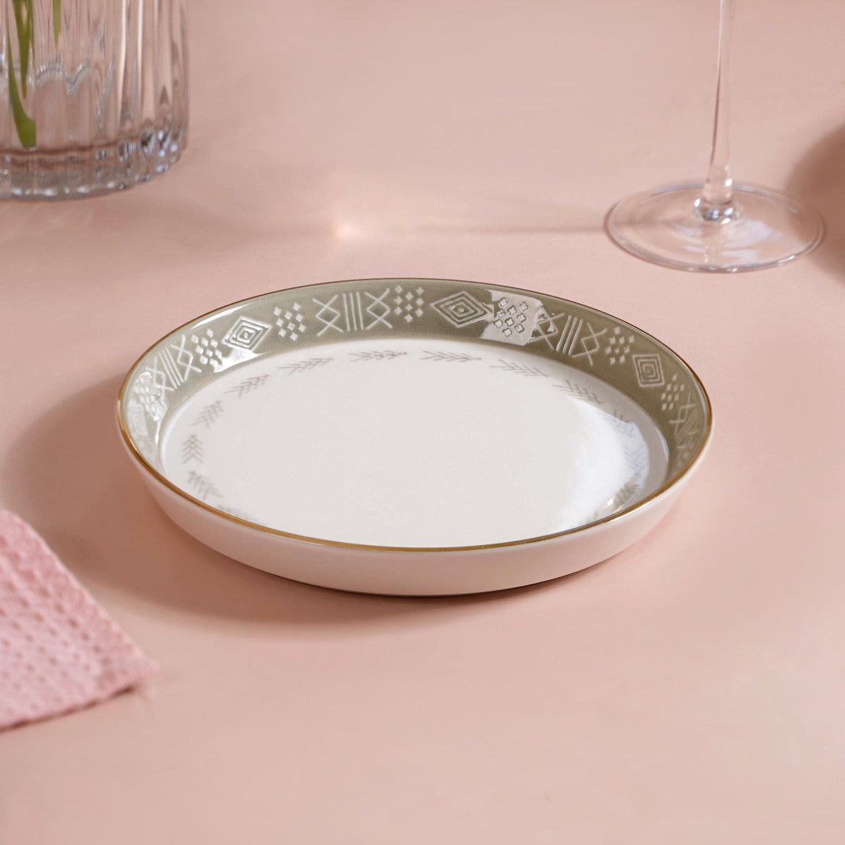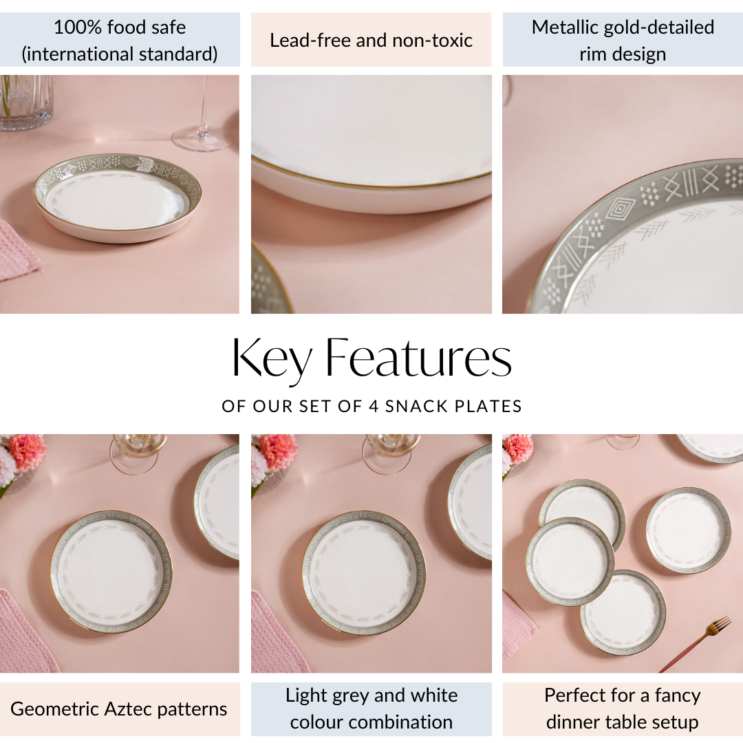 Indulge in culinary sophistication with a set of 4 snack plates from our Azo Collection. Meticulously crafted from 100% food-safe ceramic, these appetiser plates meet rigorous international standards for your peace of mind. BPA-free and non-toxic, they prioritise both safety and style. With exquisite metallic gold-detailed rims and captivating geometric Aztec patterns, each side plate is a work of art. The subtle light grey and white colour scheme adds a touch of modern elegance to any dining setting. Elevate your next dinner party or a casual gathering with the Azo grey snack plates, designed to impress.