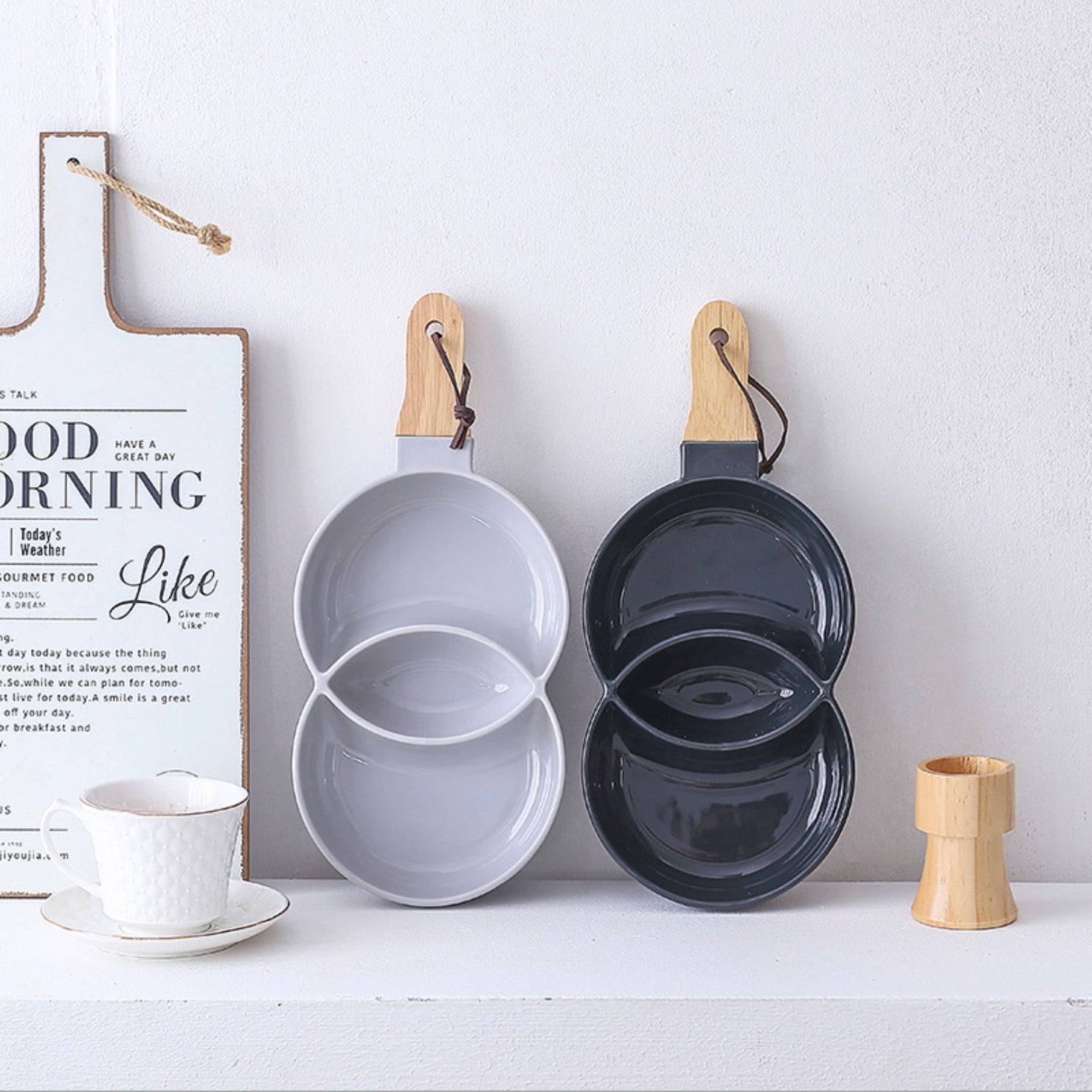 The Venn bowl is a 3 part bowl with a wooden handle for chips and dip, snacks, breakfast, fruits, salad for parties