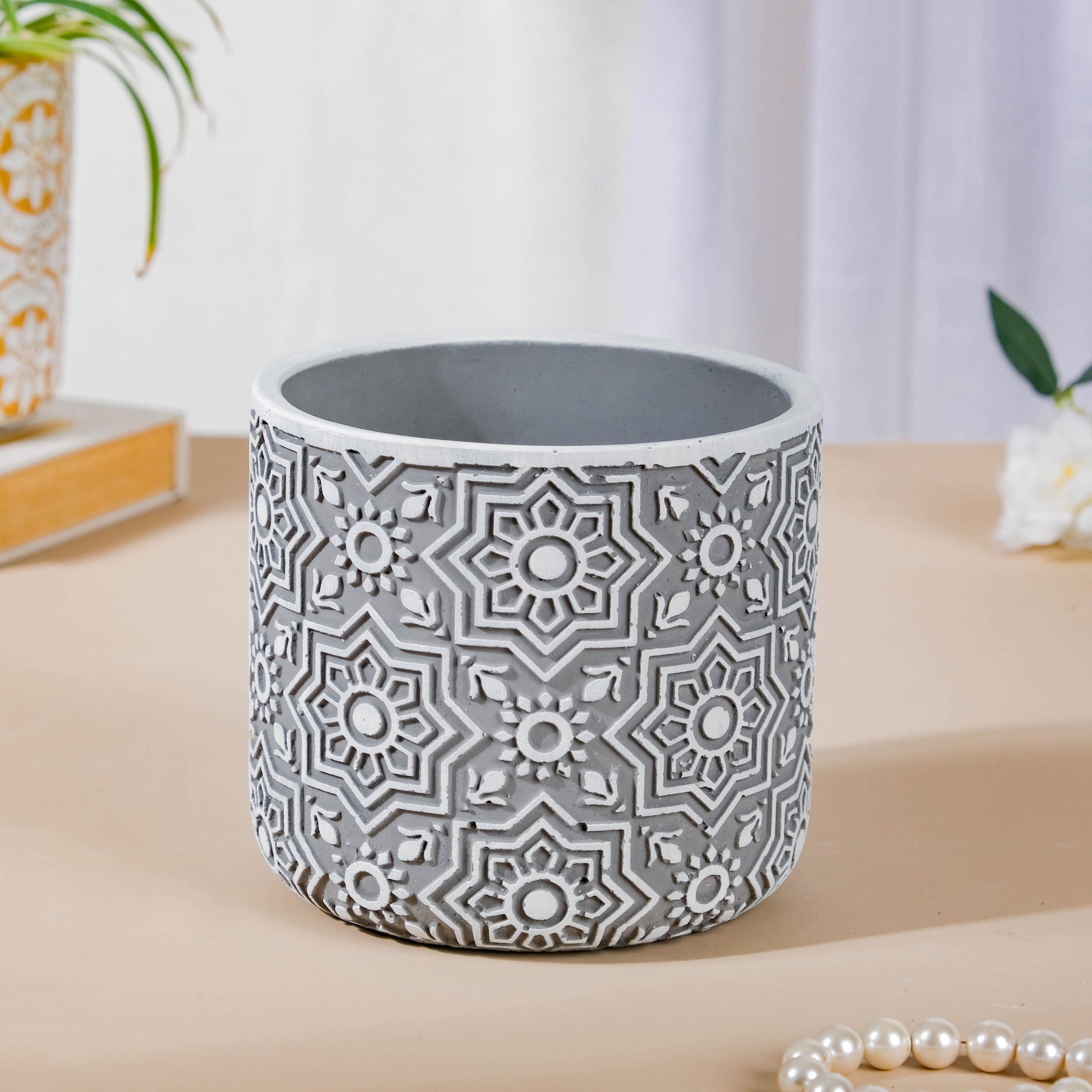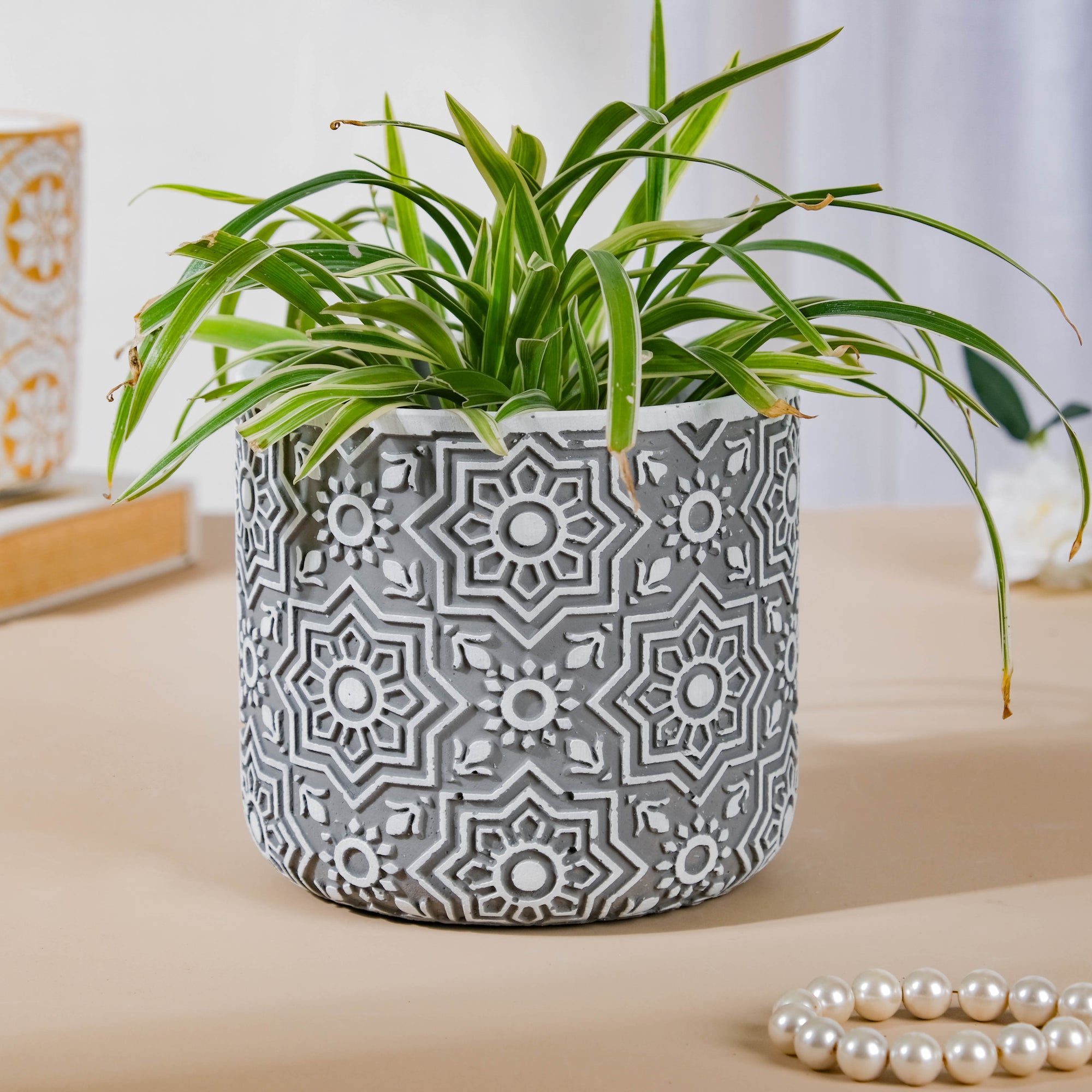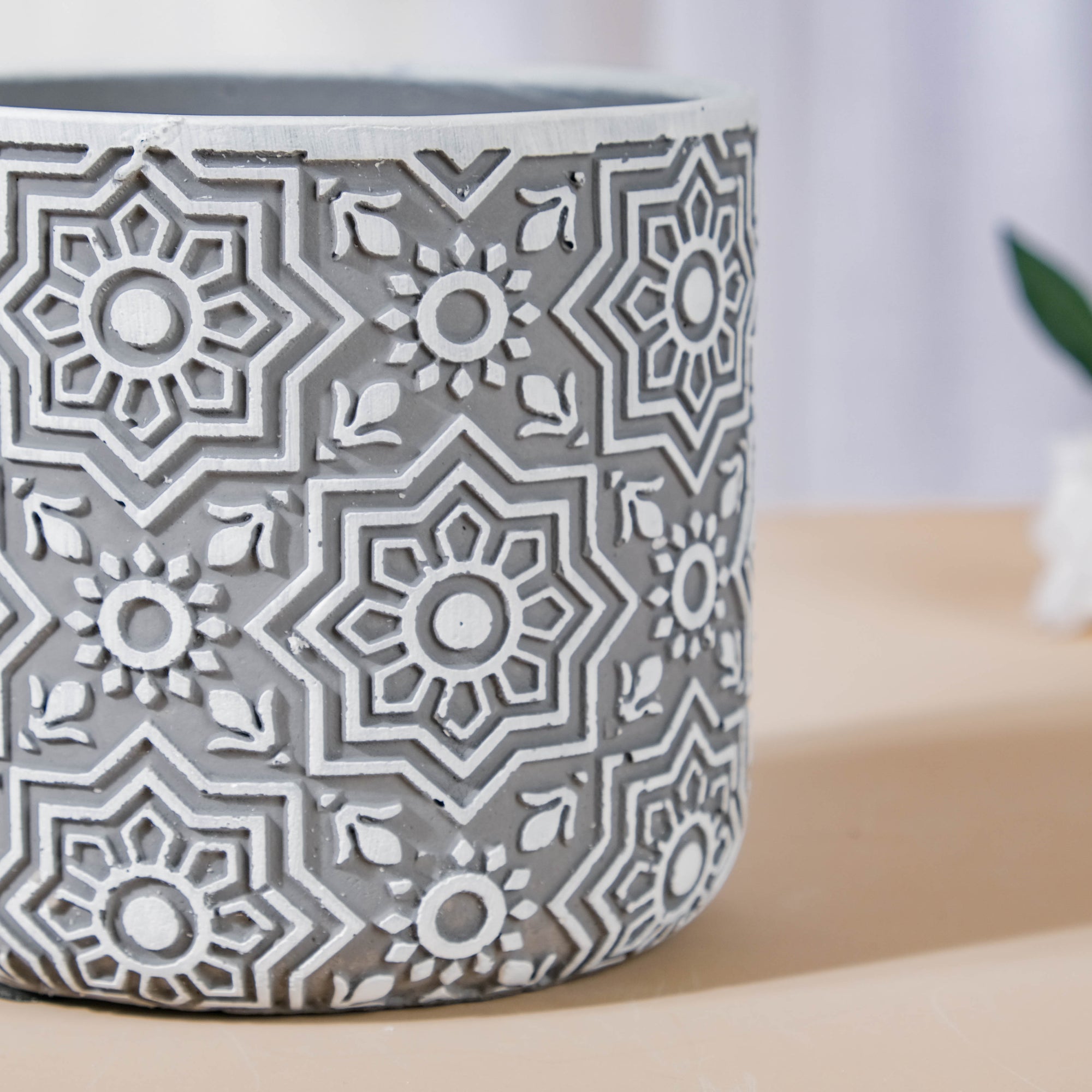 Immerse into the lush green aesthetics with this round plant pot. Plant air-purifying indoor plants such as snake plant, cactus or aloe-vera for a refreshing vibe in the room. The white geometric designs on the dark grey pot creates a striking contrast and adds a classic touch to any space. The ceramic planter can be kept by the door to give a welcoming vibe to guests who visit.