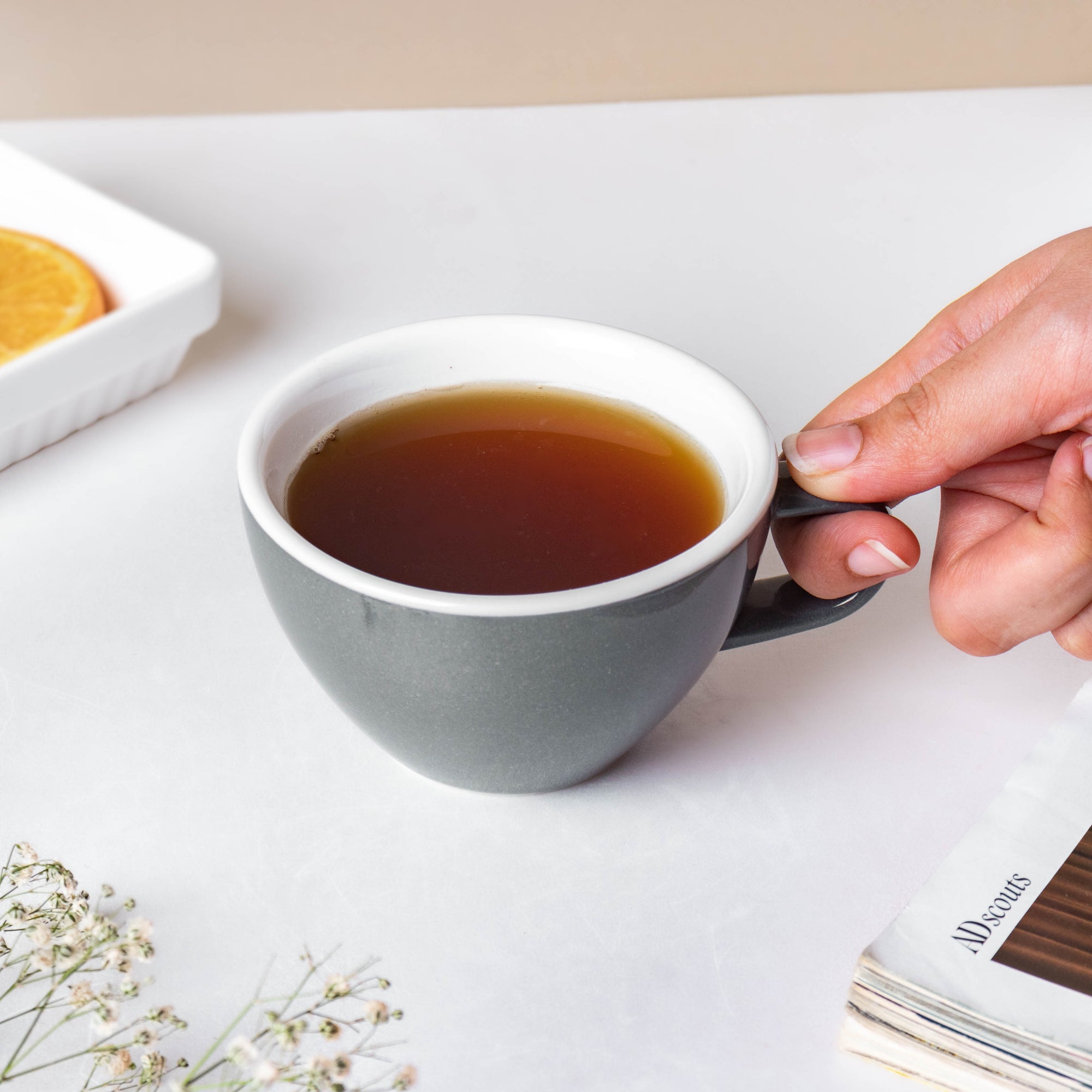 The minimalist teacup has a smooth grey finish on the outer surface and a luxurious stark white colour in its interior. The cup has a wide rim and a C-shaped handle that provides ease in holding the beverage. The cup has been designed keeping tea connoisseurs in mind, to provide the ultimate high tea experience. The classic cup can also be used to serve lattes or hot chocolate with cream or marshmallows as toppings.