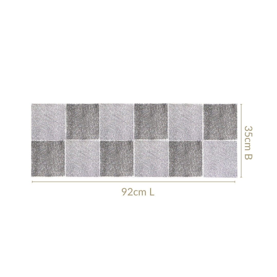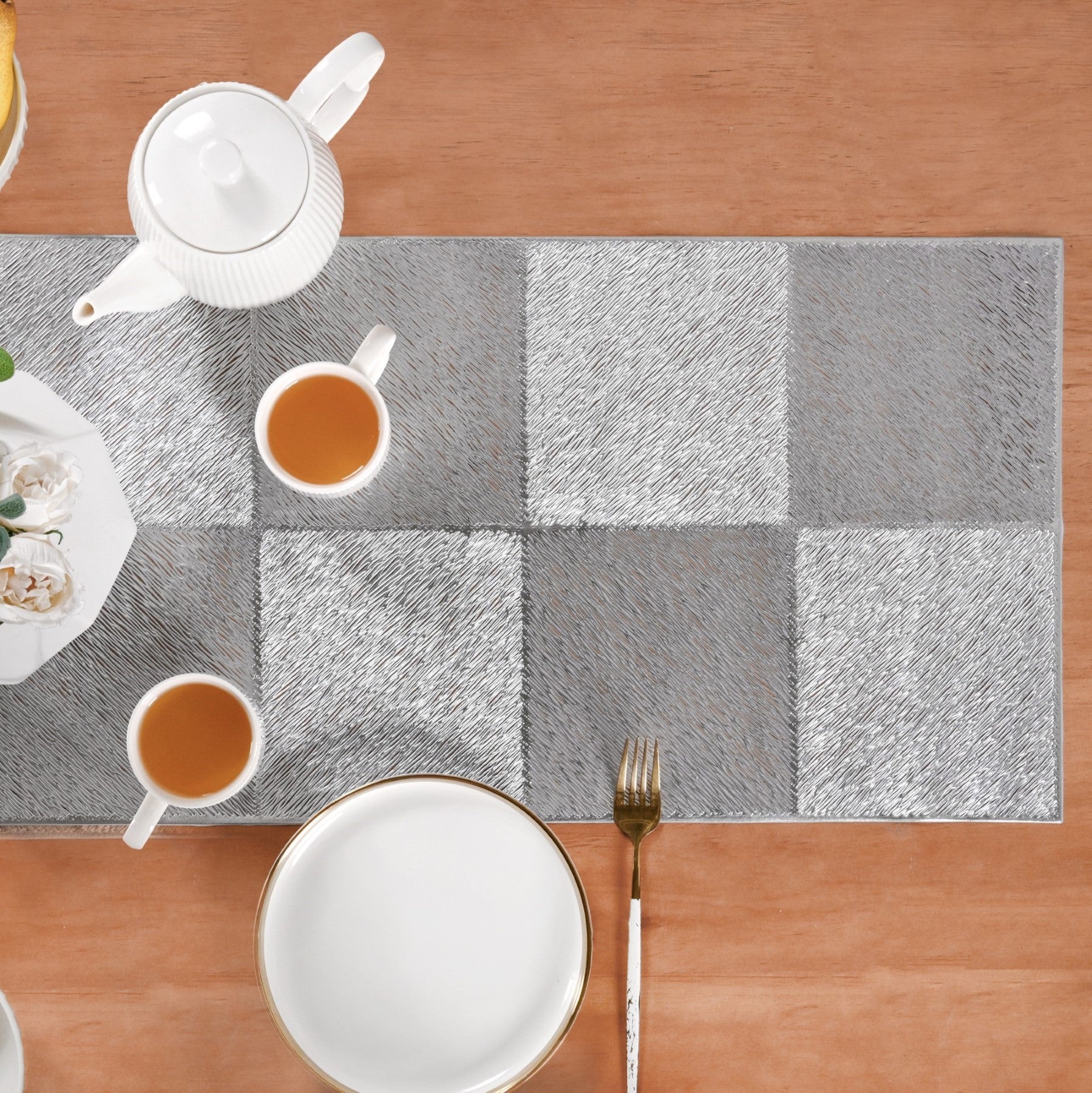 Design: This runner redefines surface décor with its incredibly distinctive texture and sleek silver finish. Its entire length is composed of an artful arrangement of uniform, subtly defined squares. Within each of these segments, a breathtaking, intricate mesh of diagonal lines shimmers, crafting a dynamic texture that beautifully plays with light and shadow. This unique, almost architectural design, reminiscent of a shimmering tiled mosaic or finely brushed metal, captures and reflects light, adding a sophisticated, almost liquid-metal allure to any setting.