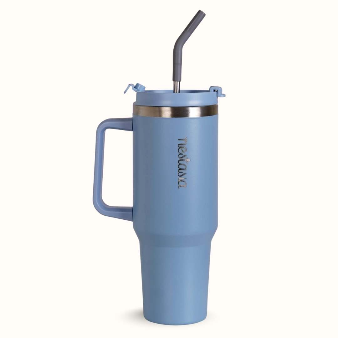 Design: Crafted from stainless steel, the tall silhouette features a gently rounded centre, a subtly tapered base, and a sturdy side handle for a comfortable grip on the go. Tri-ply insulated steel layers strengthen the body while supporting better temperature retention. The BPA-free lid comes with two sip styles, a straw opening for easy sipping and a wider mouth for bigger gulps. A protective cover shields the drinking area from dust and contact when closed. Cool-toned and confidently styled, the soft blue finish brings a calm, collected energy to wherever the day takes you.