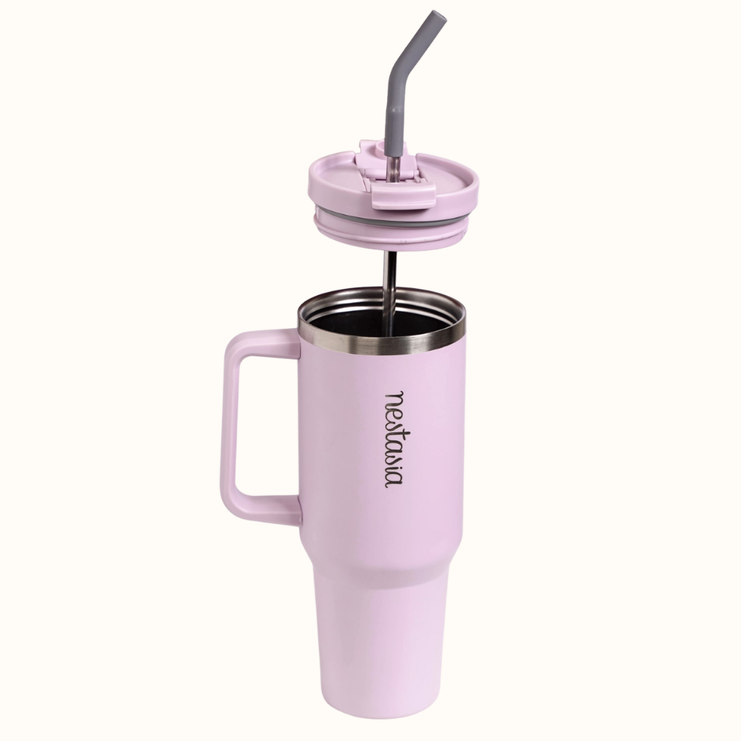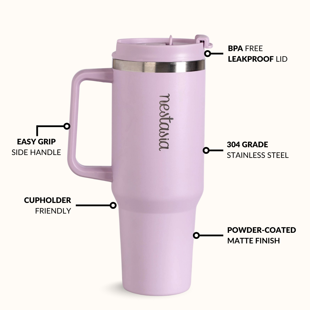Design: This tumbler features a sophisticated, smooth lilac finish, offering a soft and contemporary aesthetic. Constructed from durable stainless steel with tri-ply insulation, it maintains a sleek, sturdy profile. It is equipped with a secure side handle for portability and a versatile BPA-free lid. This lid provides two drinking options: a covered straw for tidy sips and an open spout for larger gulps, protected by a sliding cover to ensure cleanliness.