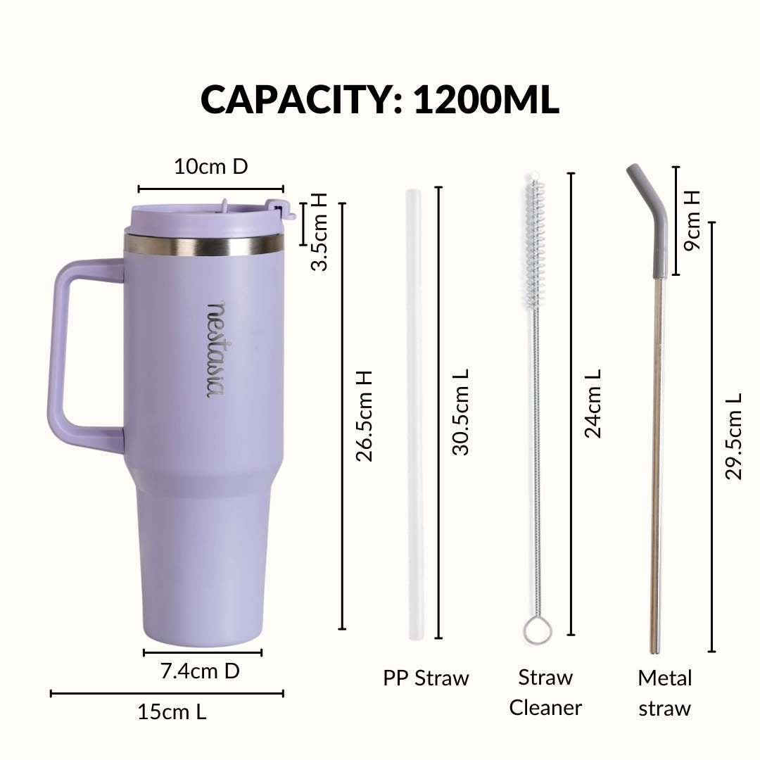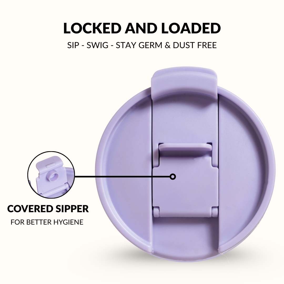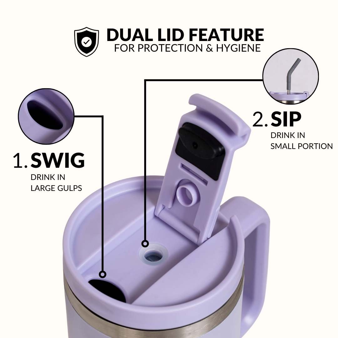 Design: This sipper features a soft purple exterior with a velvety powder-coated finish that feels as good as it looks. The tall stainless steel body has a wide centre, gently tapered base, and a solid side handle for a comfortable, easy grip. Tri-ply insulated steel layers are built within the walls, balancing form and function effortlessly. A BPA-free lid tops the bottle with two separate openings, one for straw sipping and another for wider gulps. A protective cover keeps the drinking area shielded from external exposure when not in use.