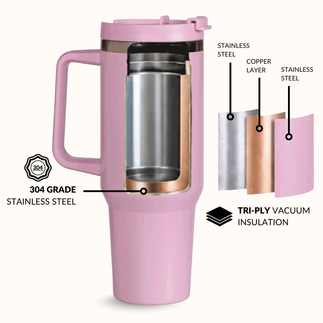 Design: Wrapped in a smooth matte pink finish, this sipper has a sleek powder-coated exterior that feels modern and refined. Its tall stainless steel body features a wide centre, a gently tapered base, and a sturdy side handle for an easy, comfortable grip on the go. Built with tri-ply insulated steel layers within the walls, it’s designed for strength and temperature control. The BPA-free lid includes two drinking options, a protected straw opening for tidy sipping and a wider spout for generous swigs. A protective cover keeps the drinking area shielded from dust and exposure when not in use. A soft yet vibrant pink adds a playful pop while still feeling polished.