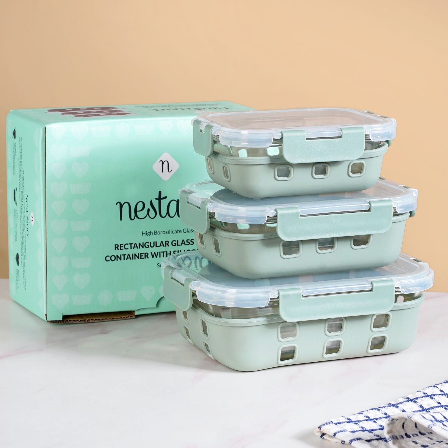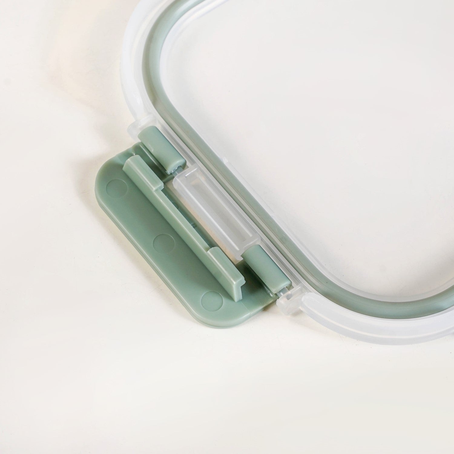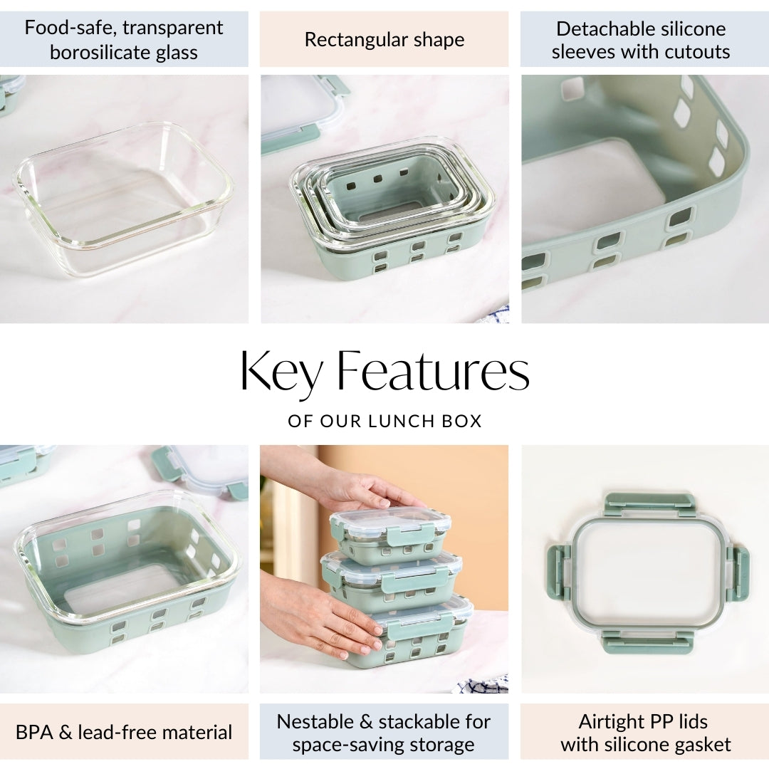 Design: The design of these rectangular food containers set with silicone sleeves is both clean and modern. Each container is crafted from transparent borosilicate glass and features a vibrant sage green silicone sleeve with stylish cutouts. The secure four-clip locking system is paired with a transparent PP lid, creating a sleek look.