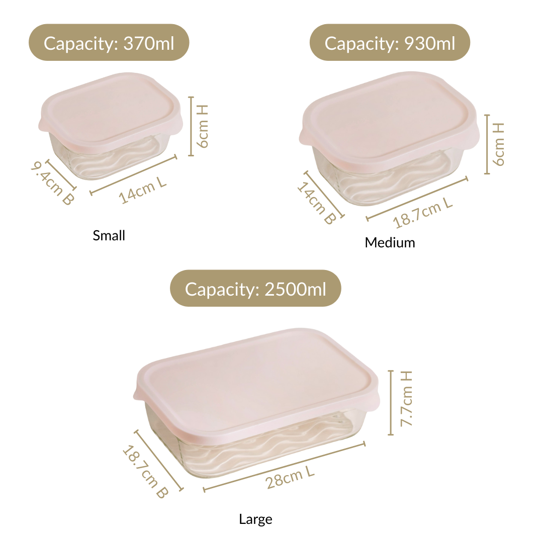 Benefits: Made from high borosilicate glass, the containers are suitable for safe everyday food storage. Their form allows them to stack securely and nest when stored away, helping save valuable space. Easy-to-open lids improve daily convenience. The grooved base helps reduce moisture buildup, supporting fresher food storage.
