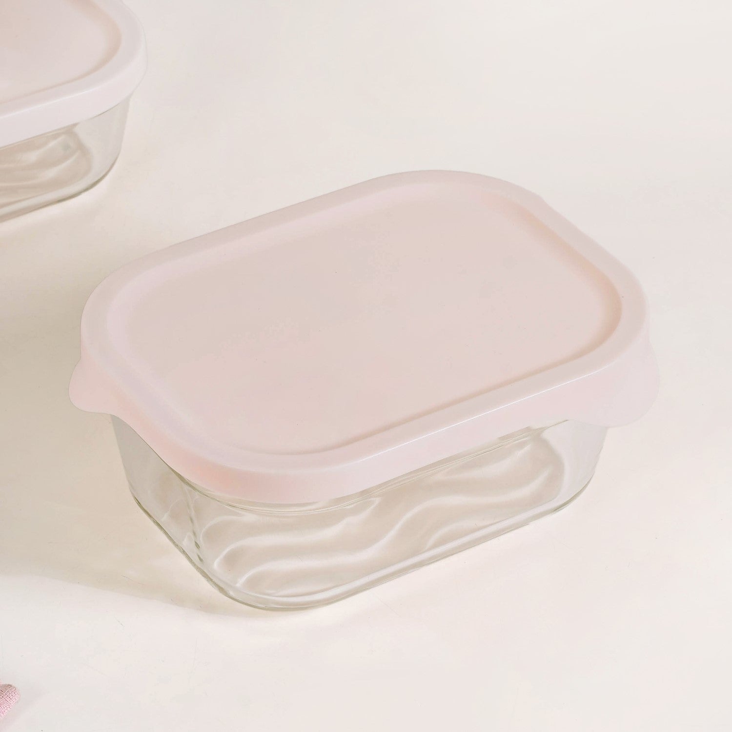 Design: This set of four storage containers features transparent glass bodies topped with soft pink lids. Each container has a balanced rectangular shape with smooth edges and a clean, organised appearance. The cohesive sizing gives the set a neat, uniform look.