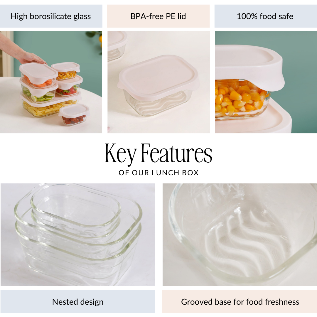 Benefits: Made from high borosilicate glass, the containers support safe food storage and daily use. The stackable and nestable structure helps save shelf and cabinet space. Easy-open lids allow quick access during meal prep. The grooved base helps food stay fresh for longer.