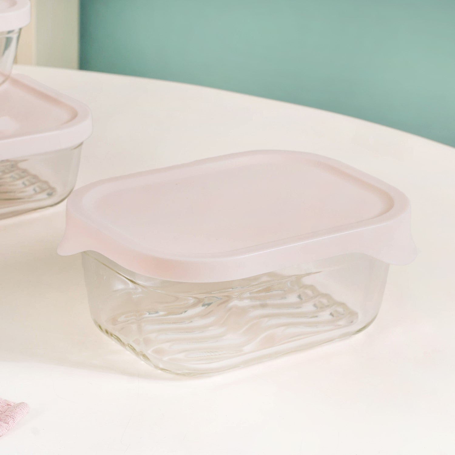 Design: This six-piece container set features transparent glass bodies paired with pink coloured lids. Each container has a clean silhouette and a smooth finish. Inside, a defined grooved base is built into the glass. Uniform sizing and shape allow the containers to stack.