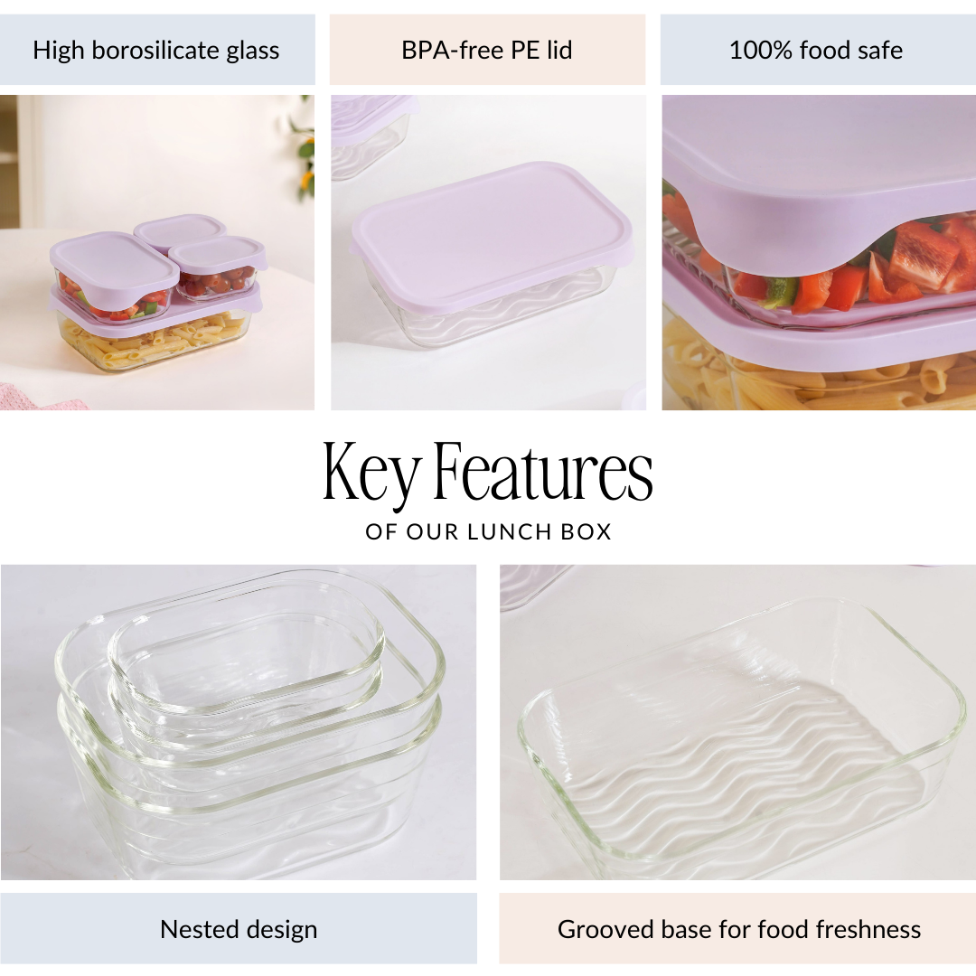 Design: Four clear glass containers come together in this set, finished with pastel lavender lids. They are rectangular in shape with softly rounded edges and a organised visual presence. Each container has a grooved base. The containers have a perfectly nested and stackable design.