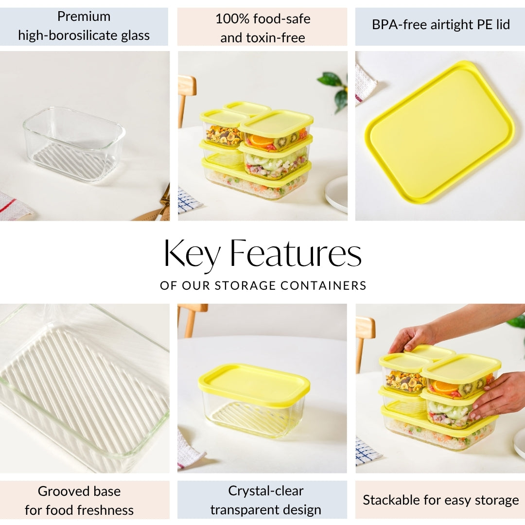 Design: Whether you're meal-prepping, storing leftovers, or packing snacks, these versatile containers are designed to simplify your kitchen routine. Compact yet roomy, they nest and stack with ease, ideal for small kitchens or busy households looking to declutter with flair. Made from high borosilicate glass, each container is heat-resistant, stain-proof, and perfect for both hot and cold storage. The ribbed glass body adds a textural detail, while the bright yellow lids lend a fresh, vibrant touch to your pantry or fridge. Their snug, flush-fit design ensures stable stacking.