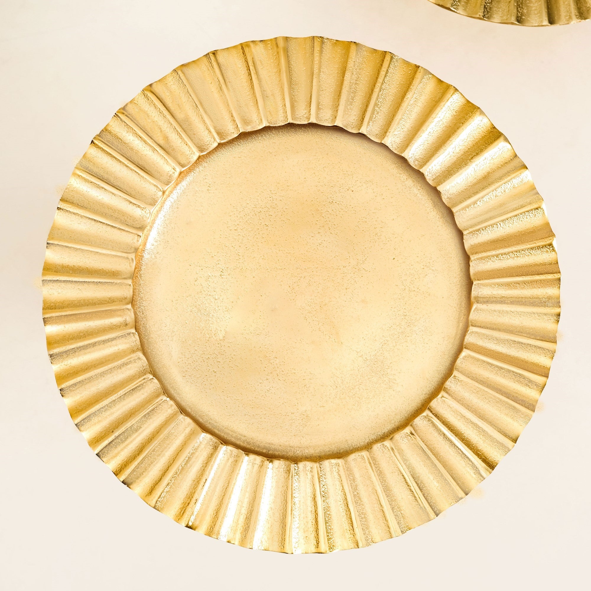 Design: This round riser features a tall, elegant pedestal base that adds height to the table and highlights even simple displays. The wide fluted rim forms a striking sunburst pattern that catches the light, while the matte gold finish offers subtle texture for a refined touch. Ribbed lines flow from the rim through the cylindrical stem, creating visual harmony. Its elevated structure allows for layered settings or dramatic presentation, while the carefully weighted base ensures stability. The gently deep top helps secure cakes, appetisers, or décor in style. Finished with a food-safe coating, it’s also ideal for serving desserts or dry snacks.