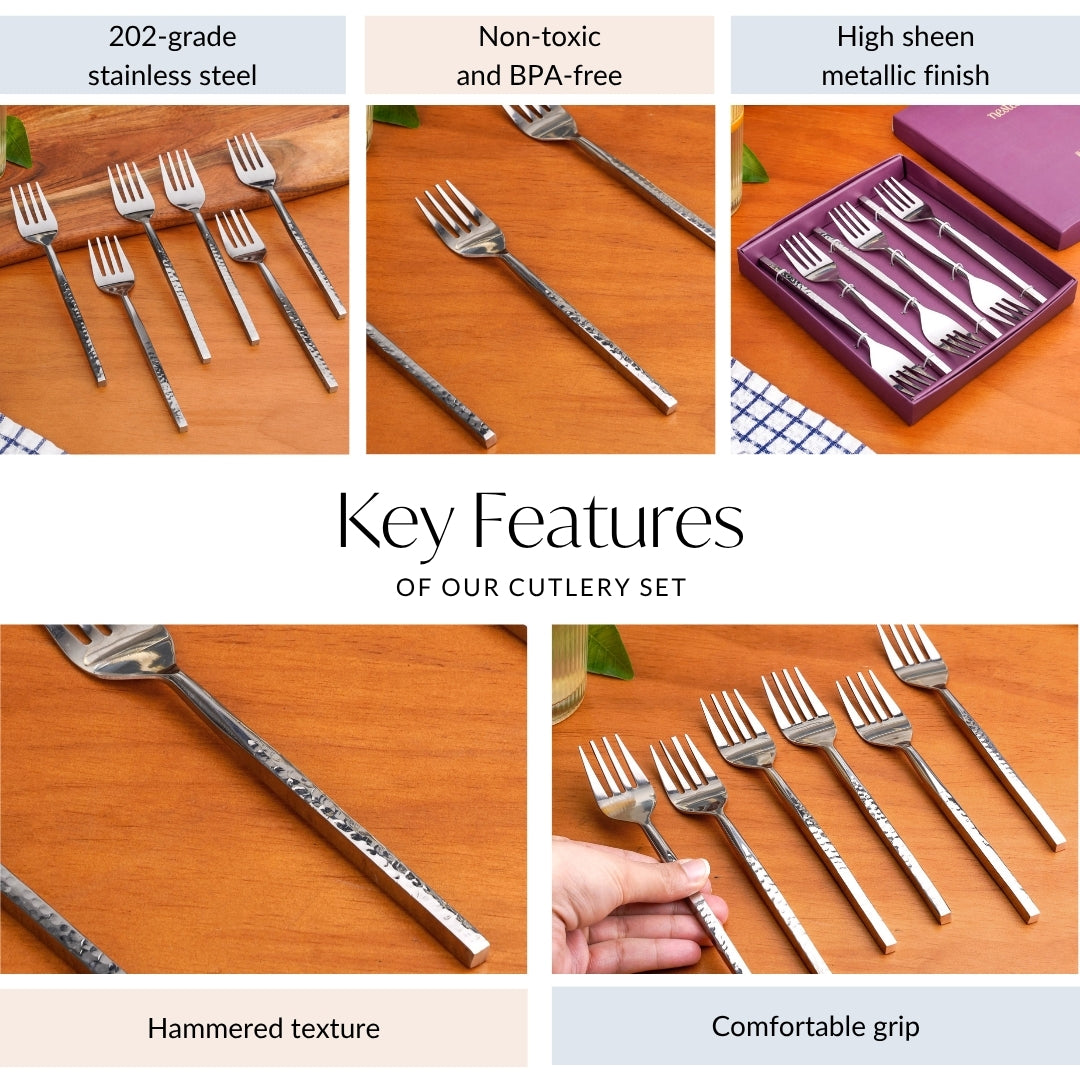 Benefits: Made from premium-grade stainless steel, the forks are food-safe, rust-resistant, and designed for long-term use without dulling or damage. The hammered finish isn’t just decorative, it allows better grip and enhances everyday usability. Easy to clean, dishwasher-safe, and designed for both casual and formal use, this set is ideal for homes that love hosting or simply appreciate good design in everyday tools. A set of six ensures you're always ready for guests or family gatherings.