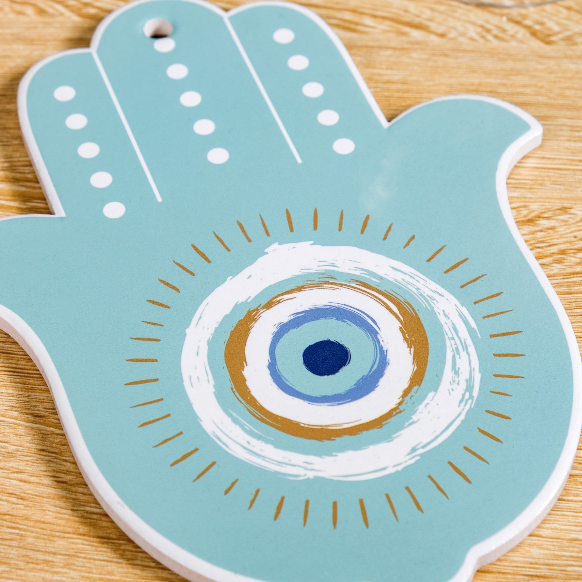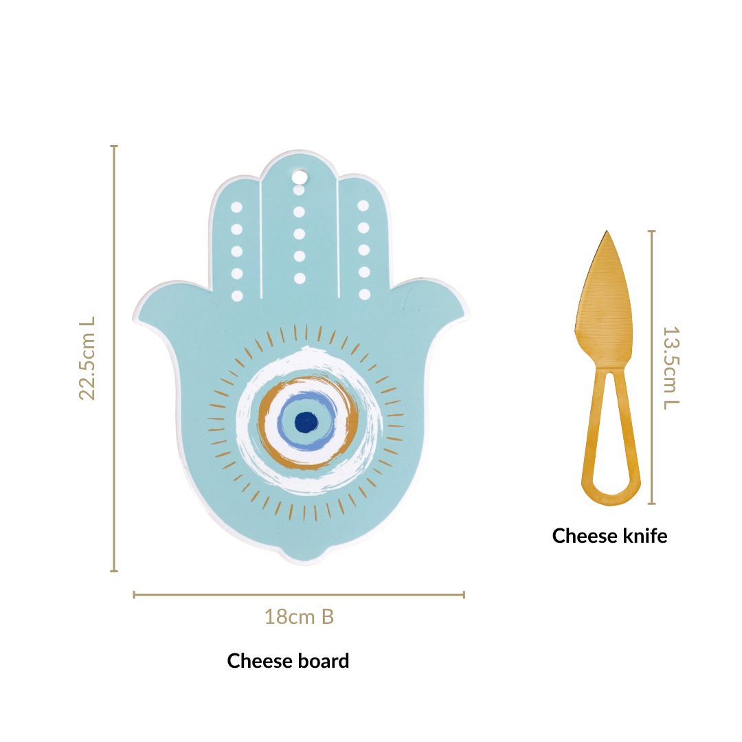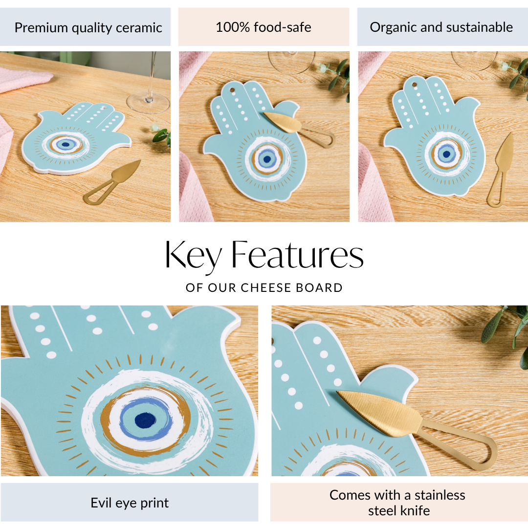 Design: Shaped like the iconic Hamsa hand and detailed with a bold evil eye motif in hues of teal, ochre yellow, and white, this serving platter tray brings a touch of art to your appetisers. The matching golden cheese knife adds a sleek finish, making your cheese board feel as indulgent as it looks, a compact statement piece for every tablescape.